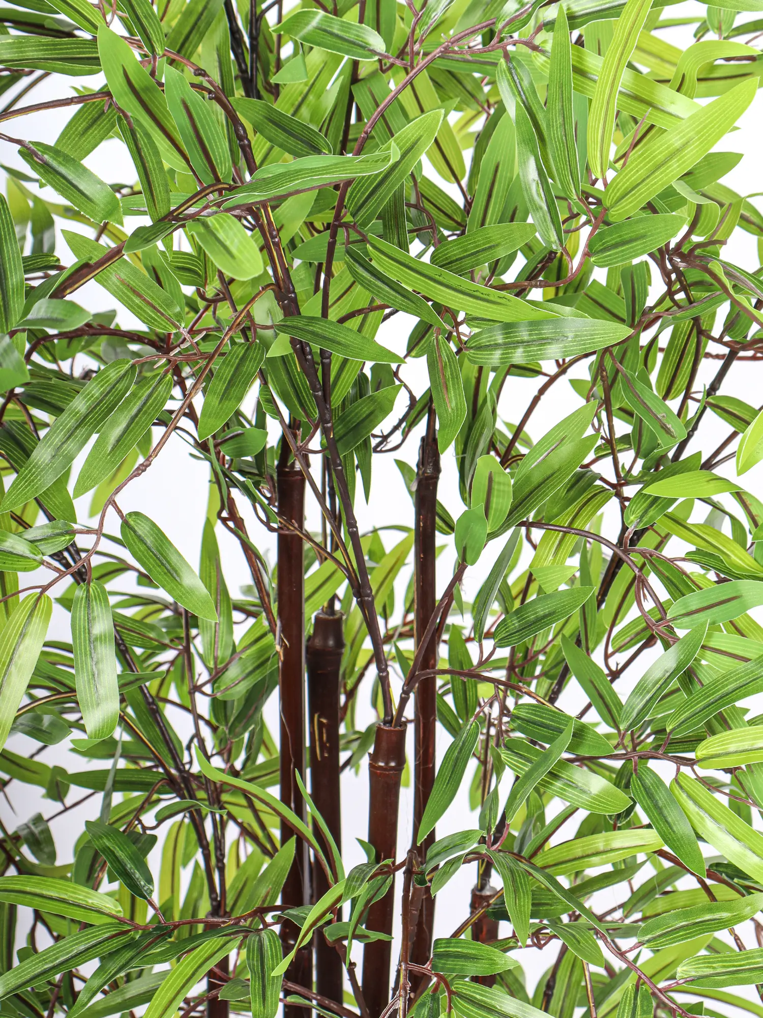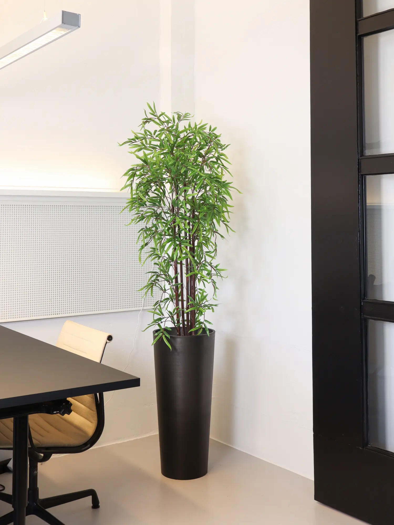 Deze zwarte kunstbamboe is geïnspireerd op de Phyllostachys Nigra, een natuurlijke zwarte bamboesoort. De donkere stammen en subtiele nerfstructuur in de bladeren zorgen voor een realistisch en luxe uiterlijk. De bladeren zijn smal en verfijnd, waardoor ze prachtig meebewegen met het licht. Net als bij echte bamboeplanten is de bladgroei aan de onderkant iets minder dicht dan aan de bovenzijde, wat de natuurlijke look versterkt. Zowel de bamboestammen als de kern van de bladeren hebben een donkere bijna zwarte kleurstelling. Het donkergroen van de bladeren gaat ook heel goed samen met de zwarte kleur van de stammen. Hiermee ontstaat een heel bijzondere donkere bamboe kunstplant die net even anders dan anders is.