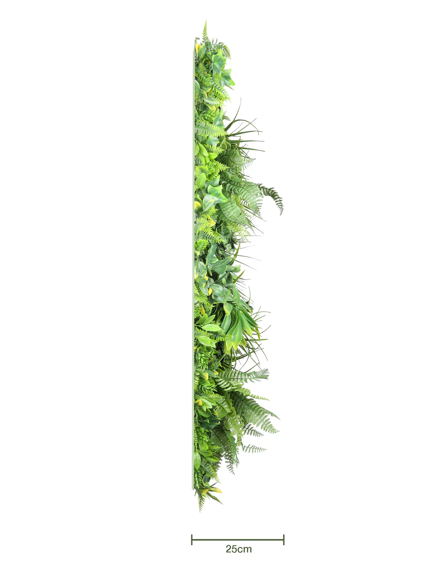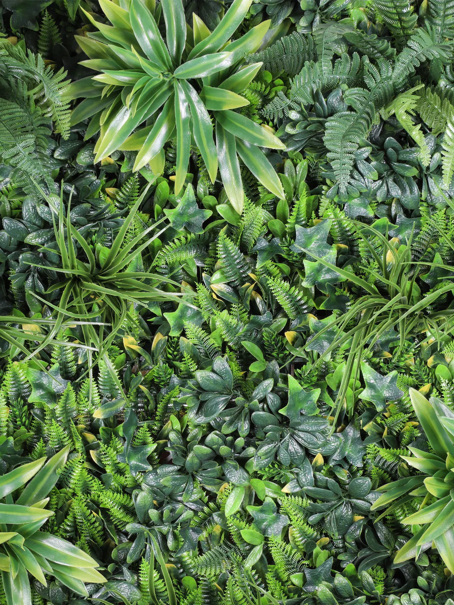 De Groene Mix Kunstplantenwand onderscheidt zich door zijn hoogwaardige materialen en levensechte uitstraling. De matten zijn zorgvuldig samengesteld met een mix van kunstplanten die variëren in vorm, kleur en formaat, wat zorgt voor een realistische en natuurlijke look. De verschillende bladeren en plantensoorten zijn niet symmetrisch geplaatst, waardoor er een speels en organisch effect ontstaat dat lijkt op een echte groene wand.