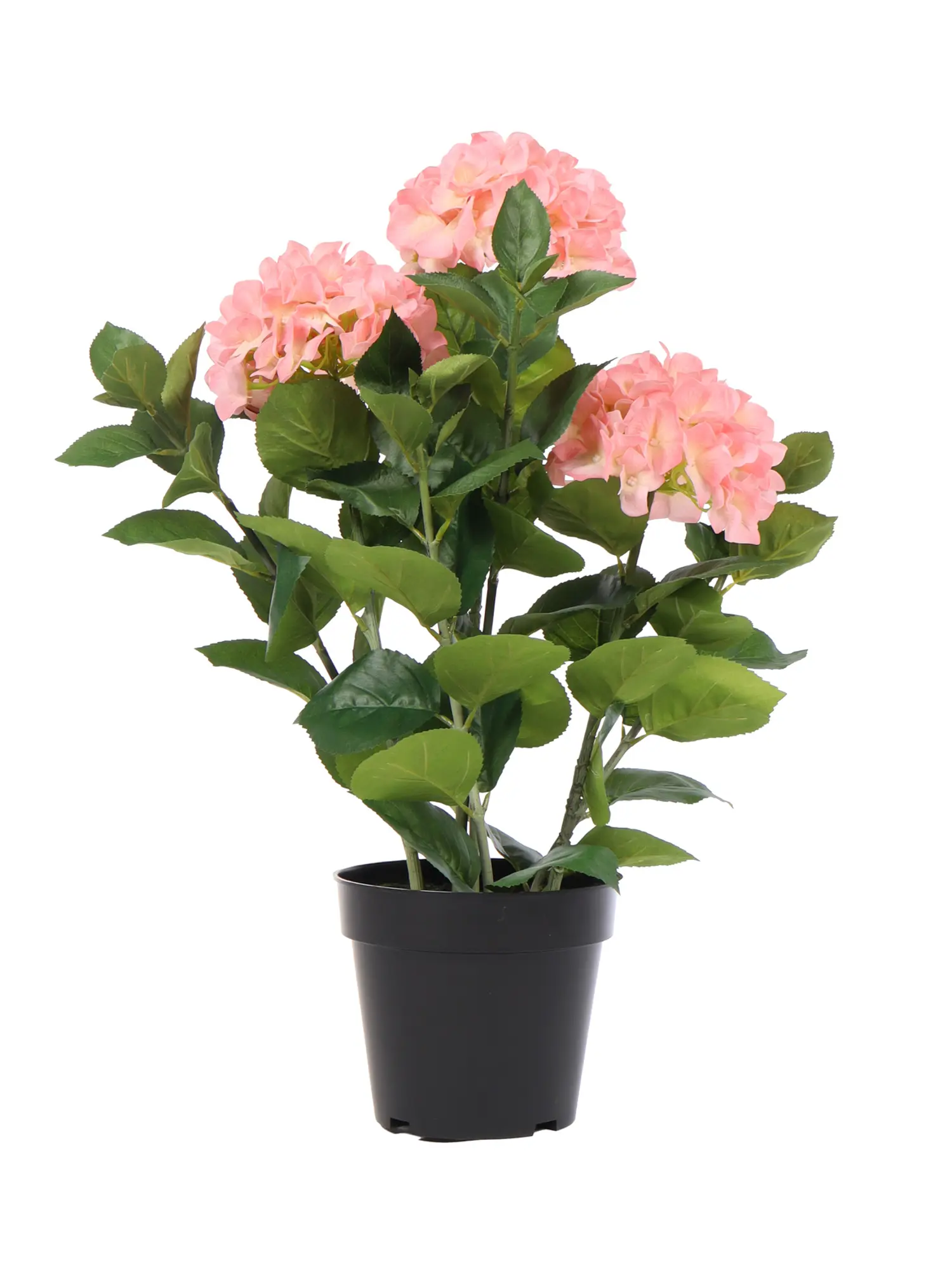 De namaak hortensia roze heeft bladeren tot onderaan in de pot.