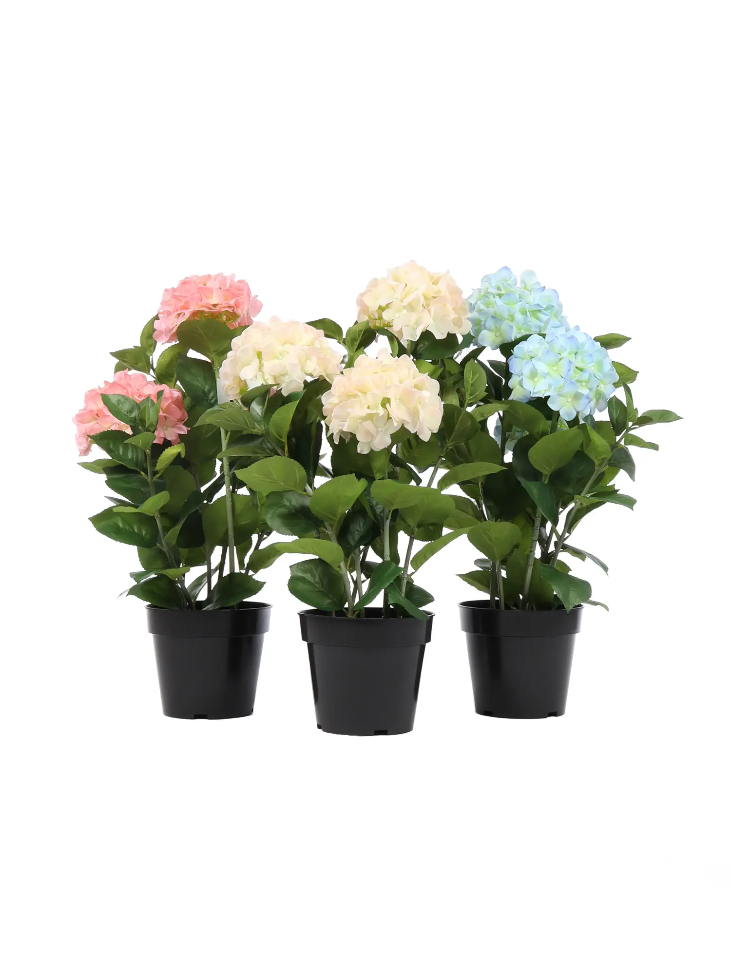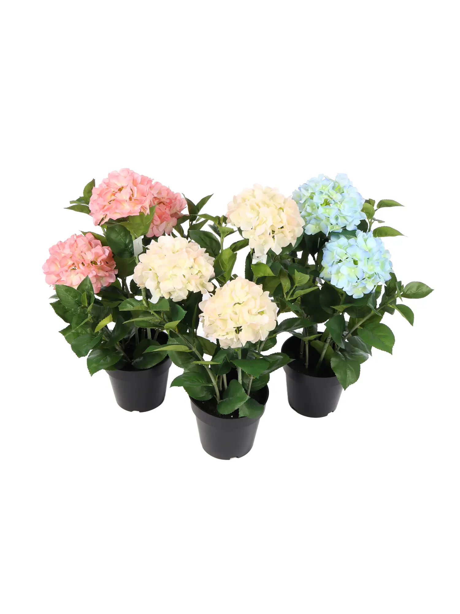 Behalve deze roze kunsthortensia leveren wij ook de blauwe en witte variant van deze kunstbloemplant.