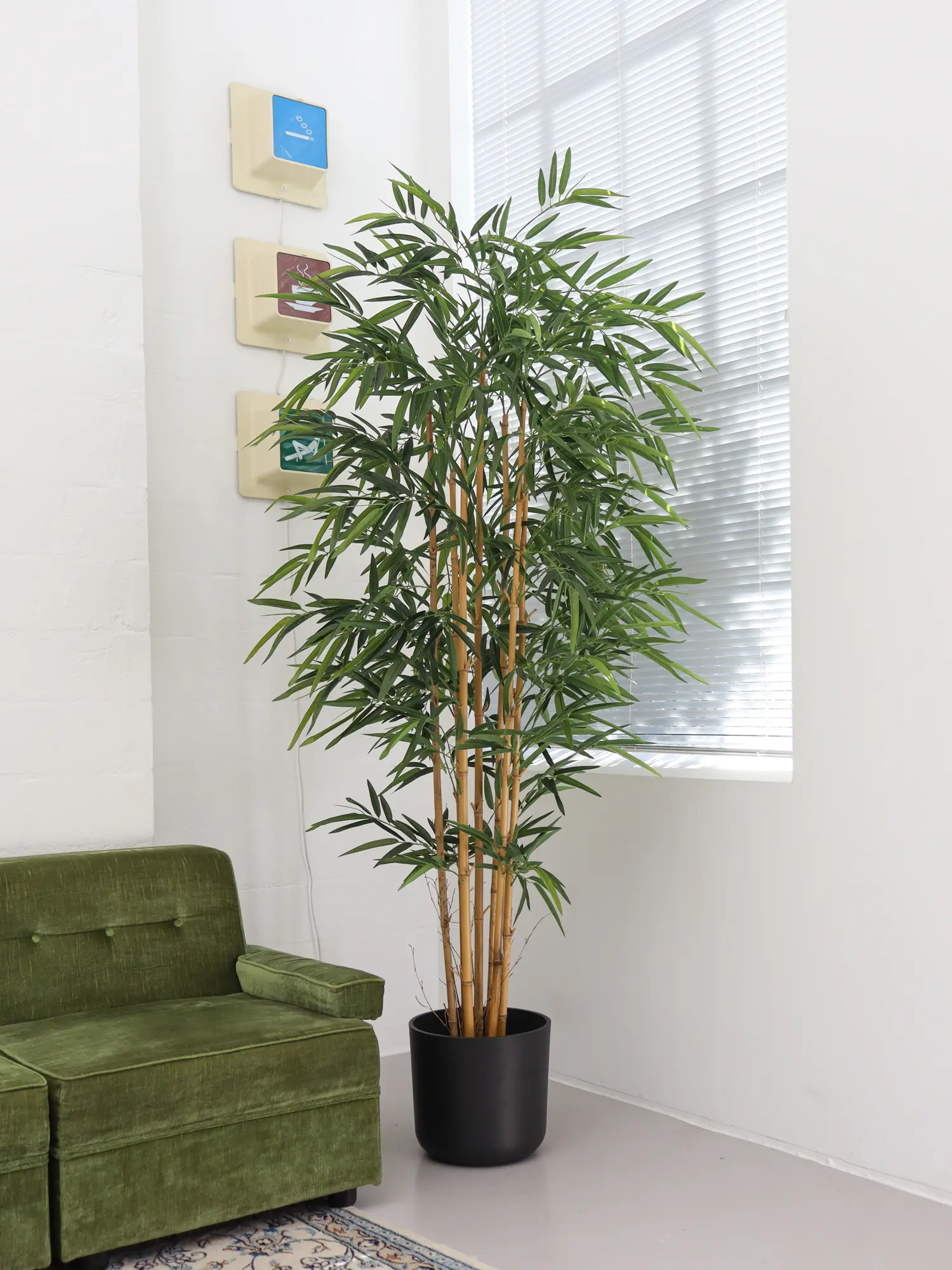 Deze grote namaak bamboeplant draagt bij aan een fijne exotische sfeer.