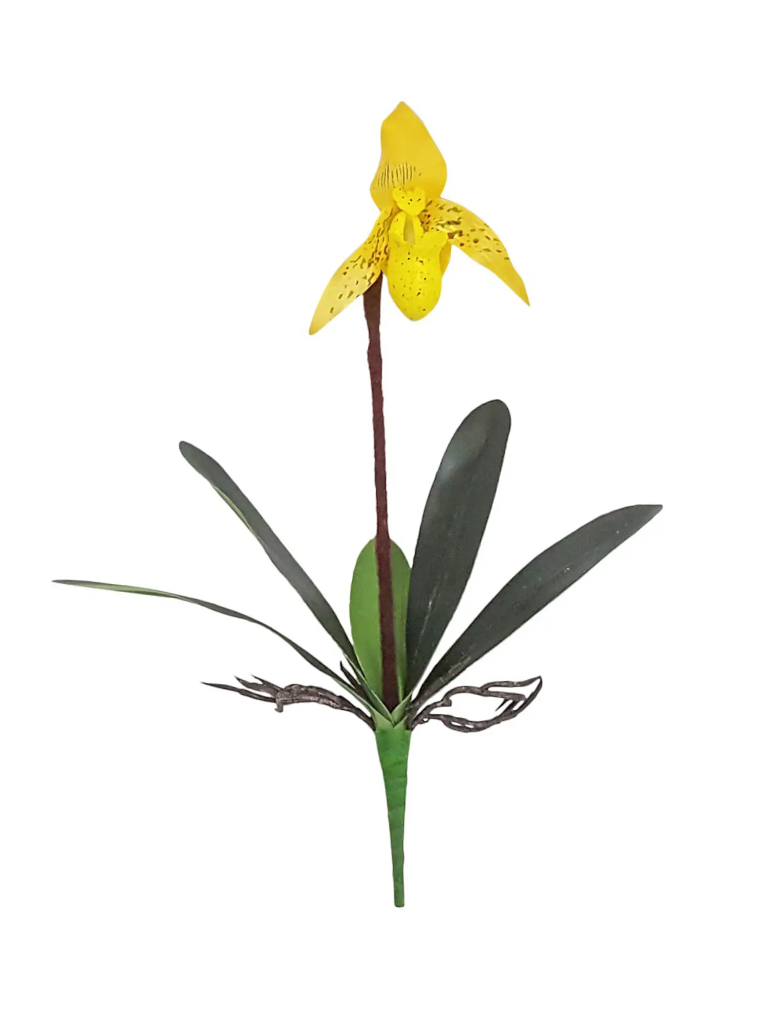 De stengel van Kelk Kunst Orchidee Geel 40cm is bruin van kleur en is over de lengte voorzien van bruine haartjes.