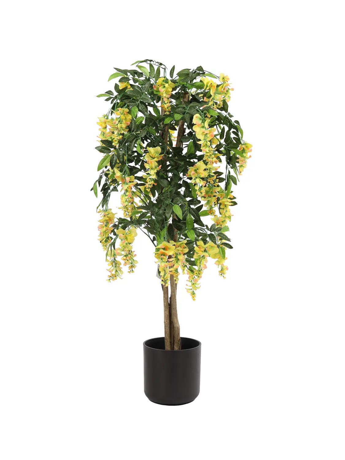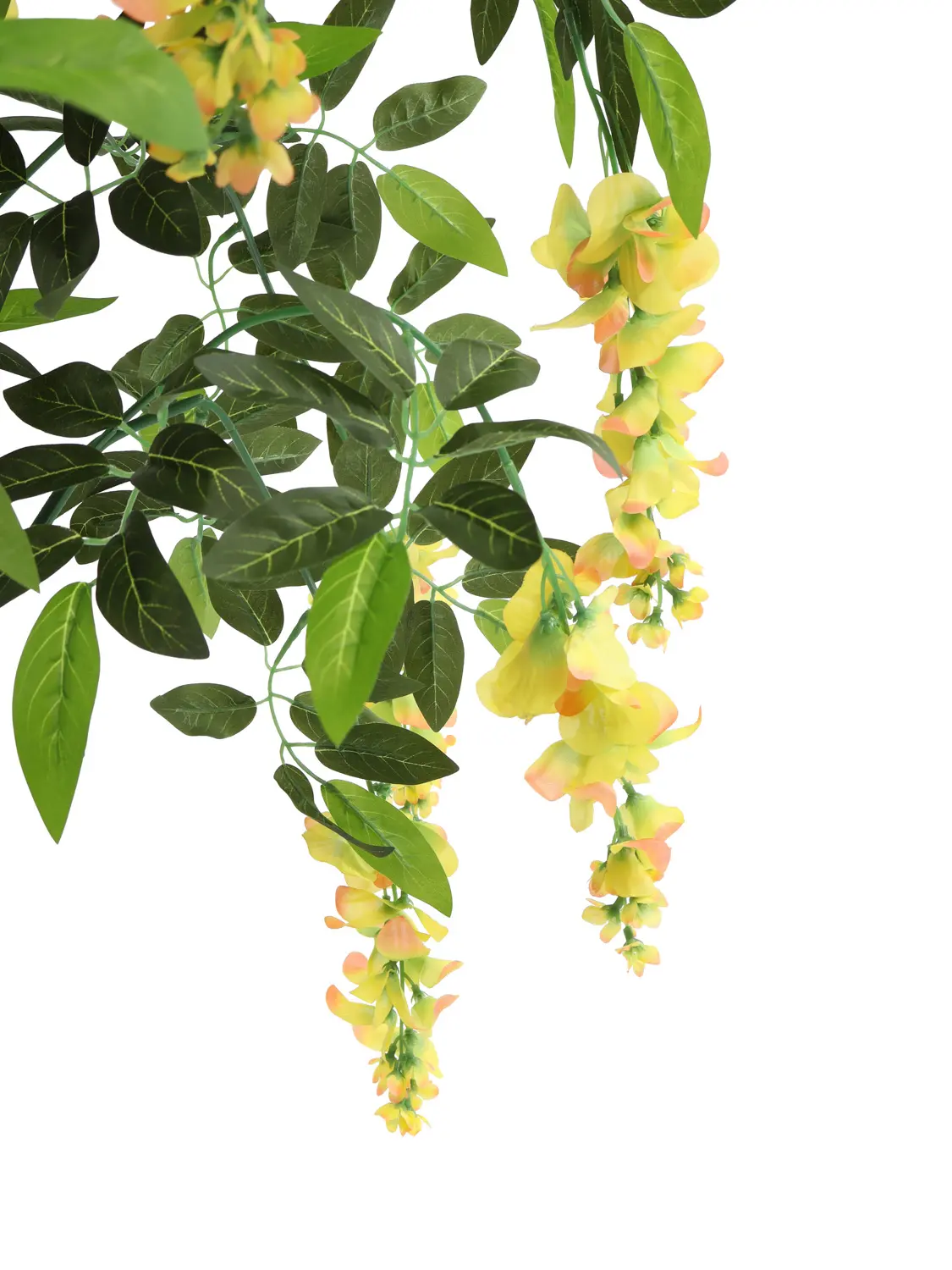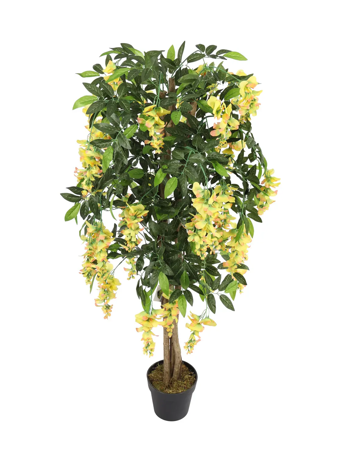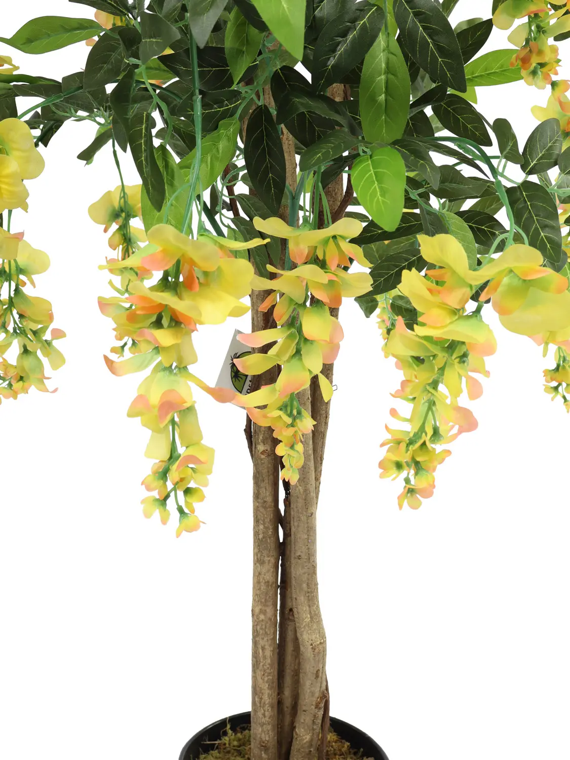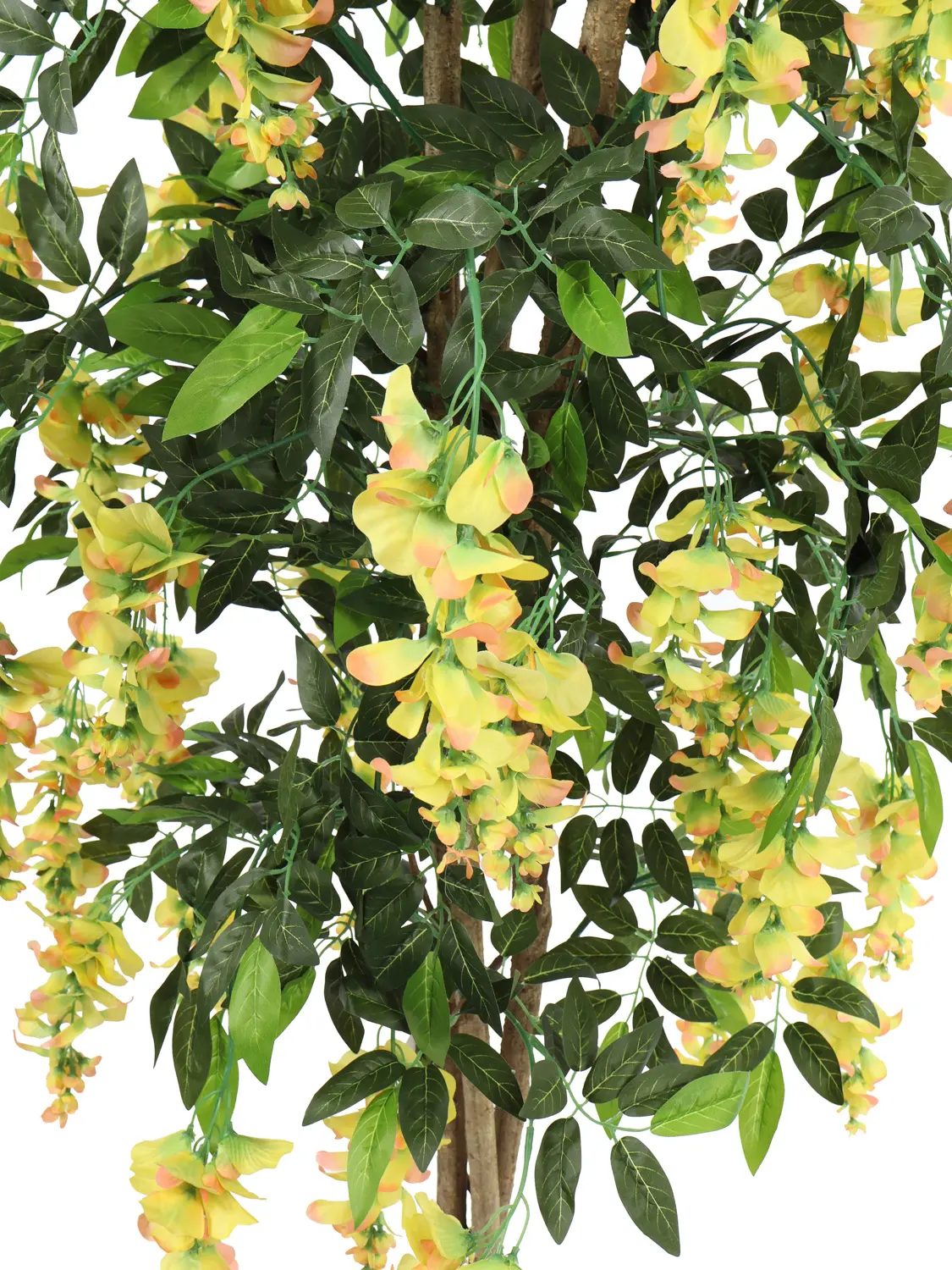 Zoals de andere kunstplanten in deze serie is ook de Kunst bloemboom Kiruna Geel voorzien van mooie gekrulde liaan houten stammetjes. De kunstbloemplant is verder voorzien van veel stevige grote diep geel gekleurde kunst bloemtrossen welke samen met de takken goed zijn vastgezet in het hout van de boom.