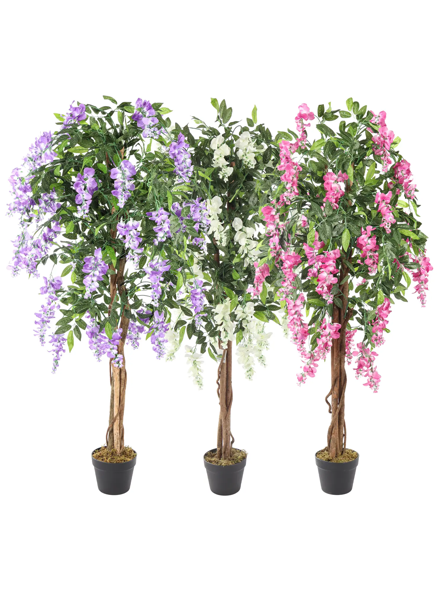 Het geheel is afgewerkt in een stevig terra of zwart kleurig potje waarin de kunstplant goed blijft staan. Na het uitpakken kun je eenvoudig de takken en bloemtrossen in model laten vallen.