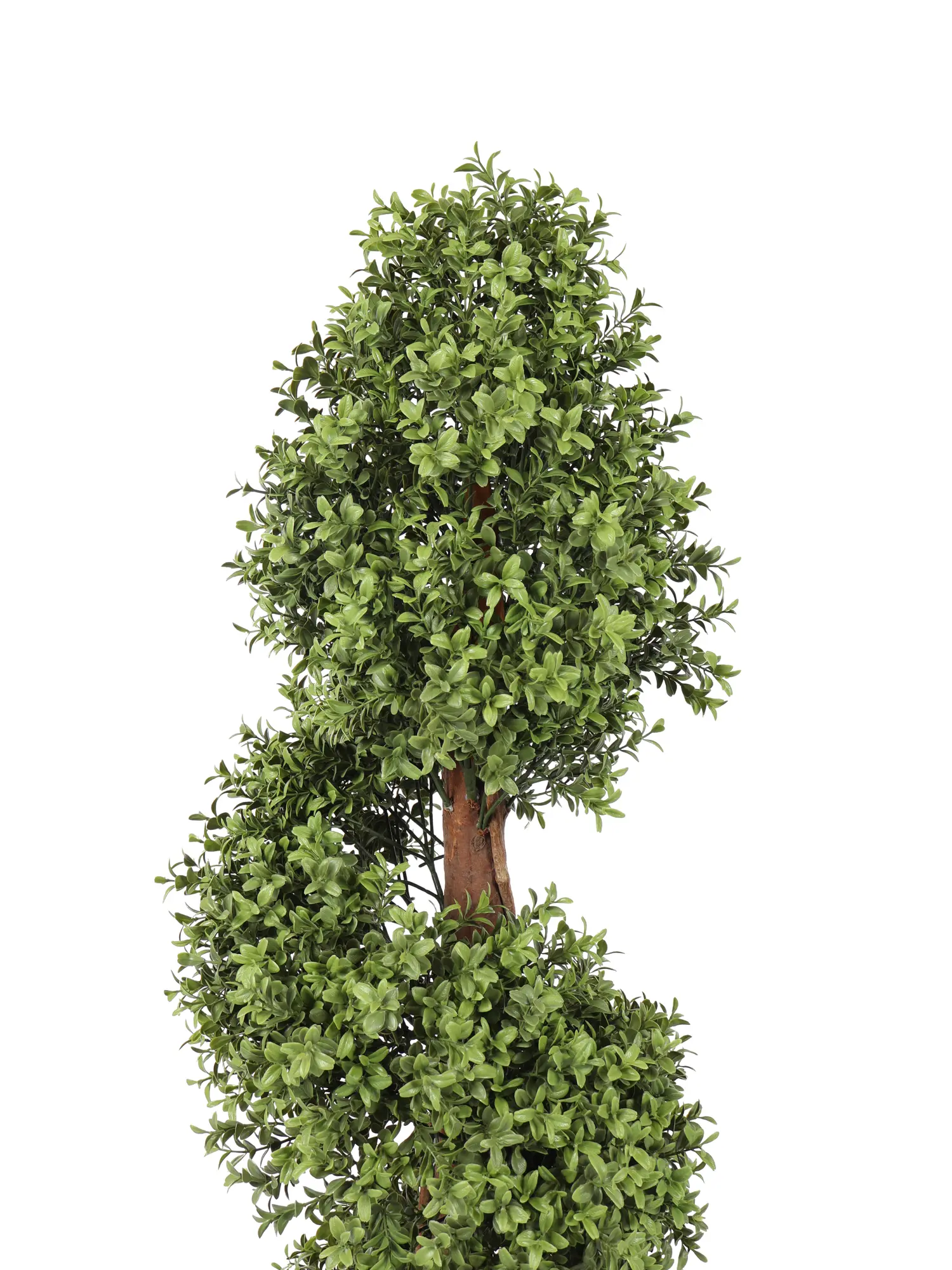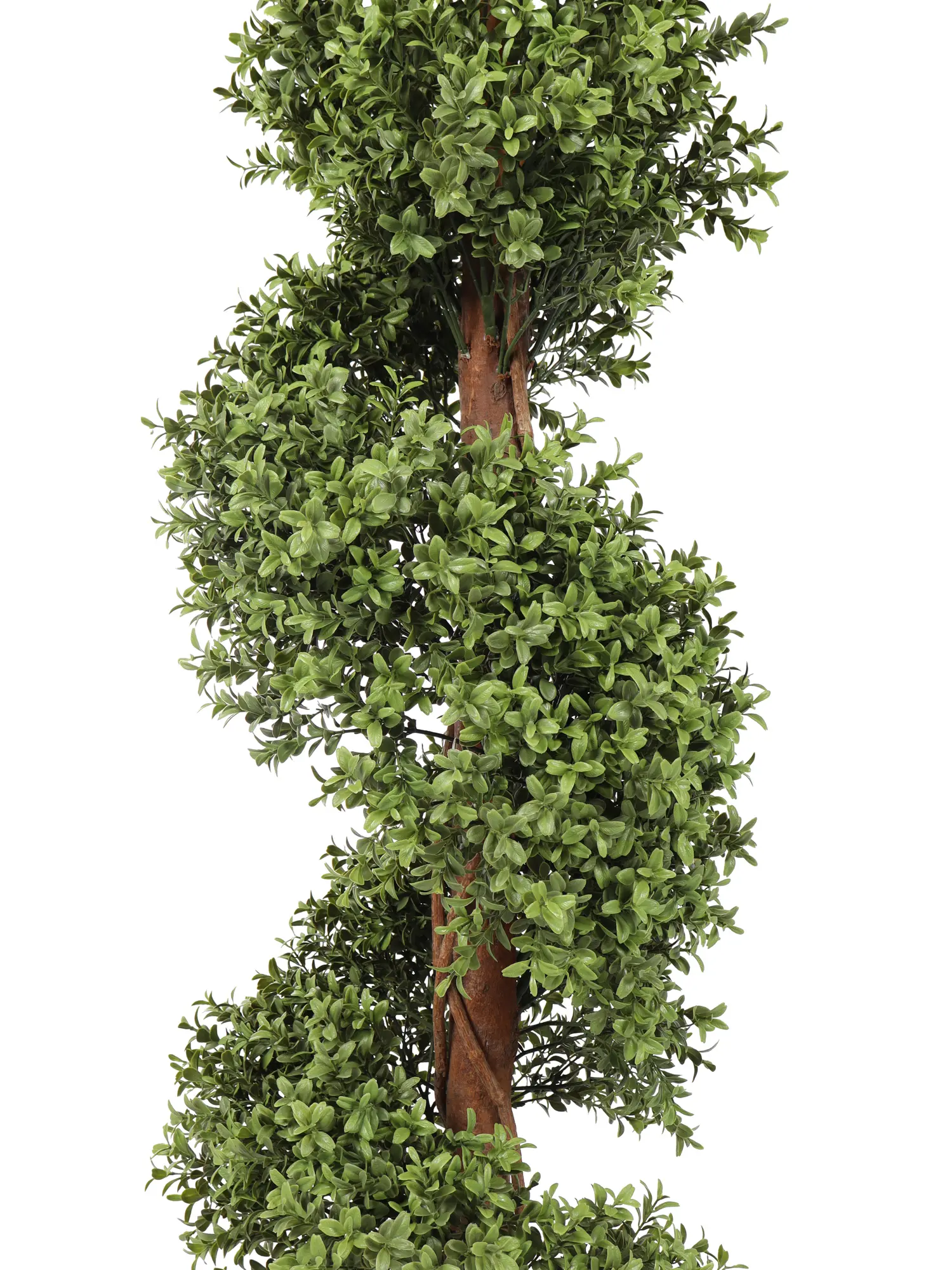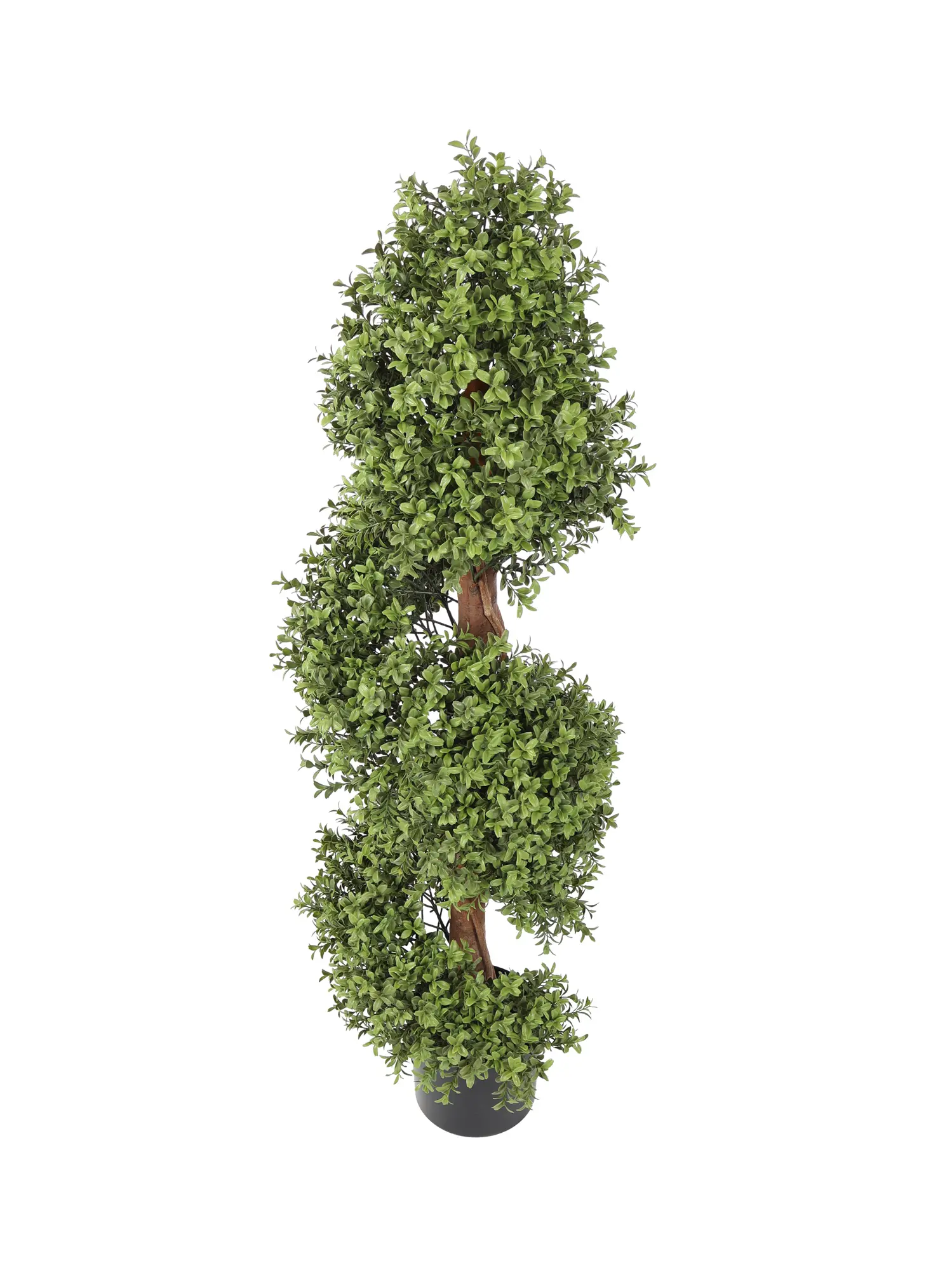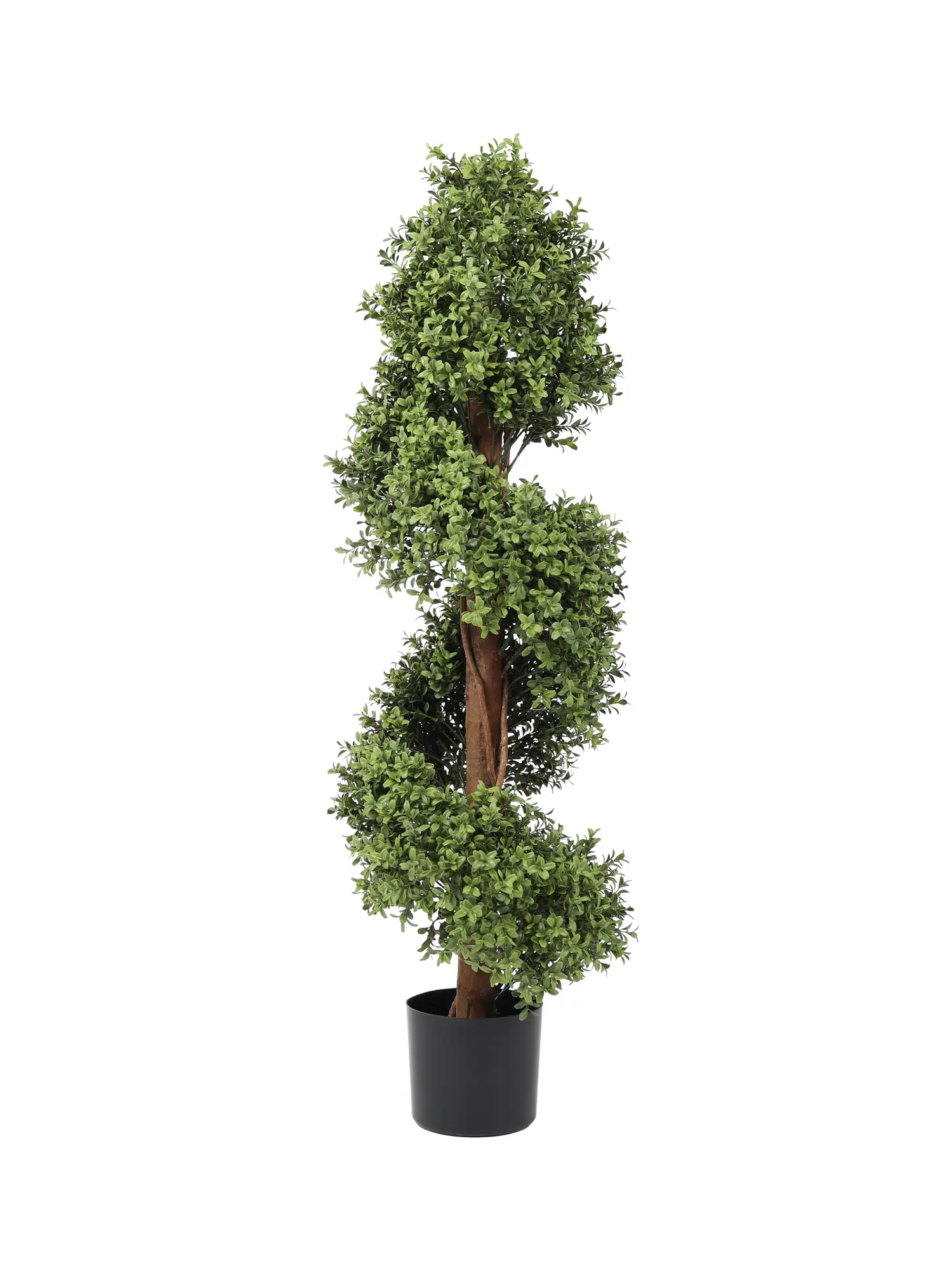 Behalve een fraaie vorm heeft de spiraalvormige kunstbuxus een mooie zachtgroene kleur.