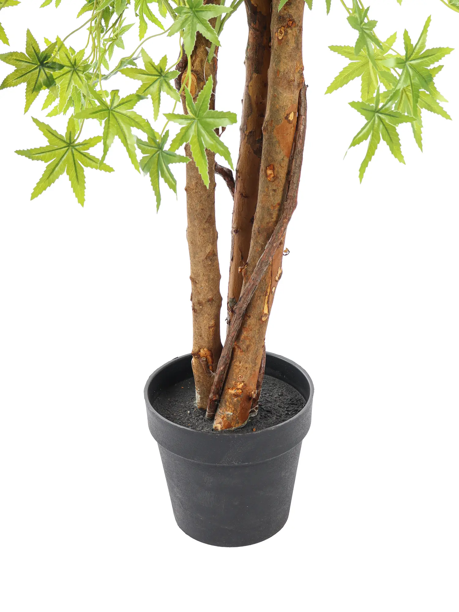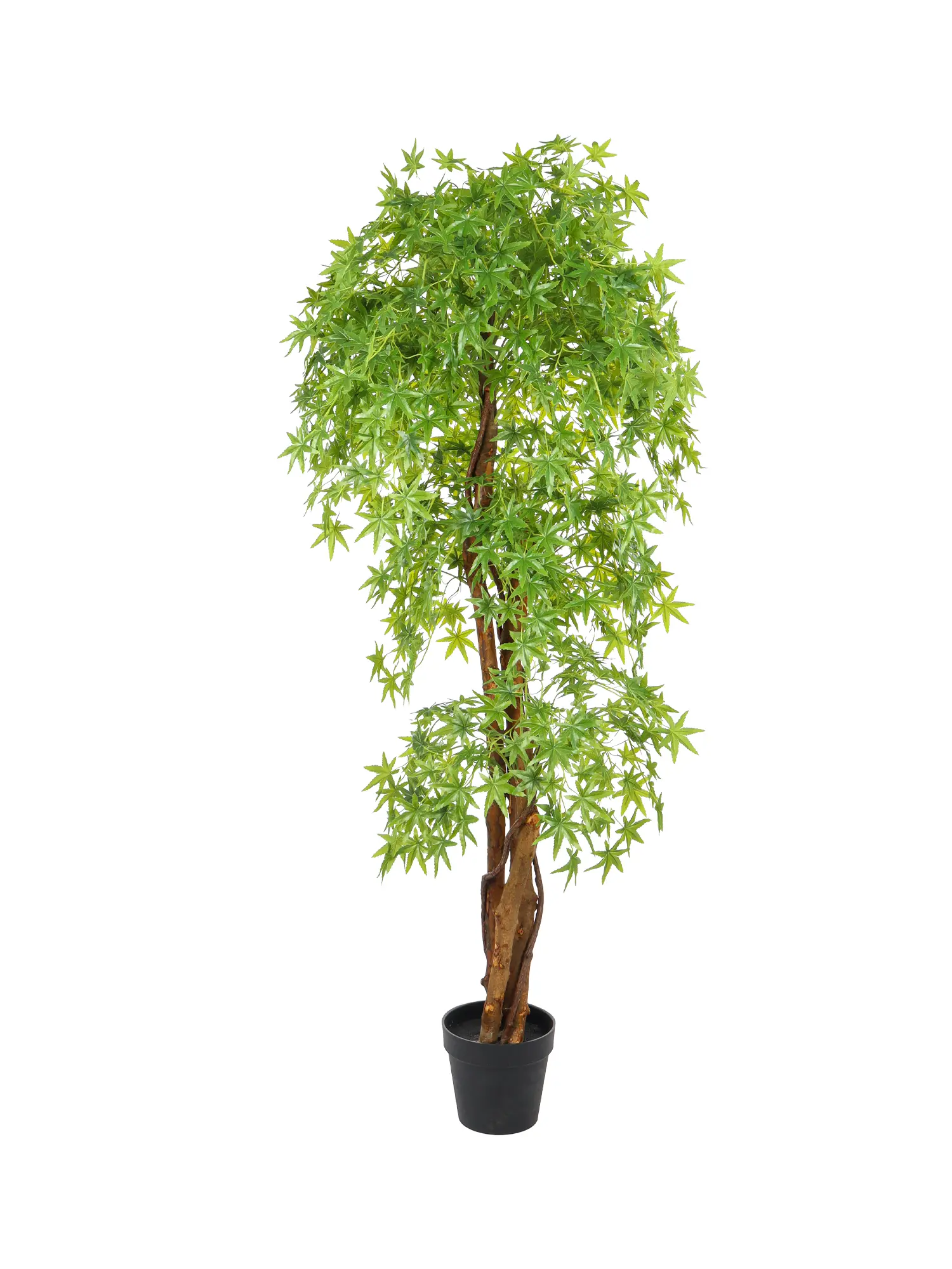 Deze Kunst Esdoorn Groen 175cm is een fraaie kunstloofboom met heldergroene takken en levensechte grote esdoornbladeren. Het betreft een netjes afgewerkte kunstboom van 175 cm hoog, voorzien van drie sierlijk door elkaar kronkelende stammen. Rondom deze stammen zijn bovendien echte liaantakken gedraaid, wat het geheel een extra natuurlijke uitstraling geeft.