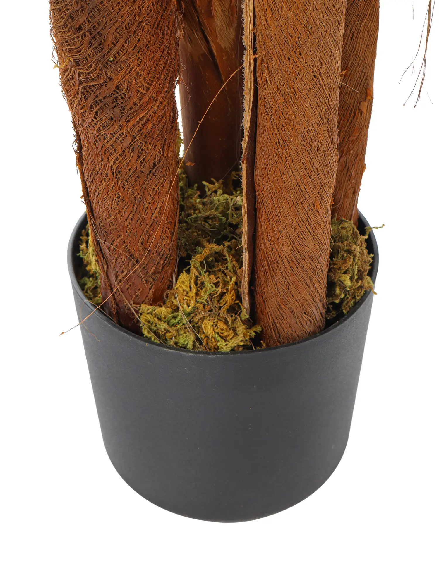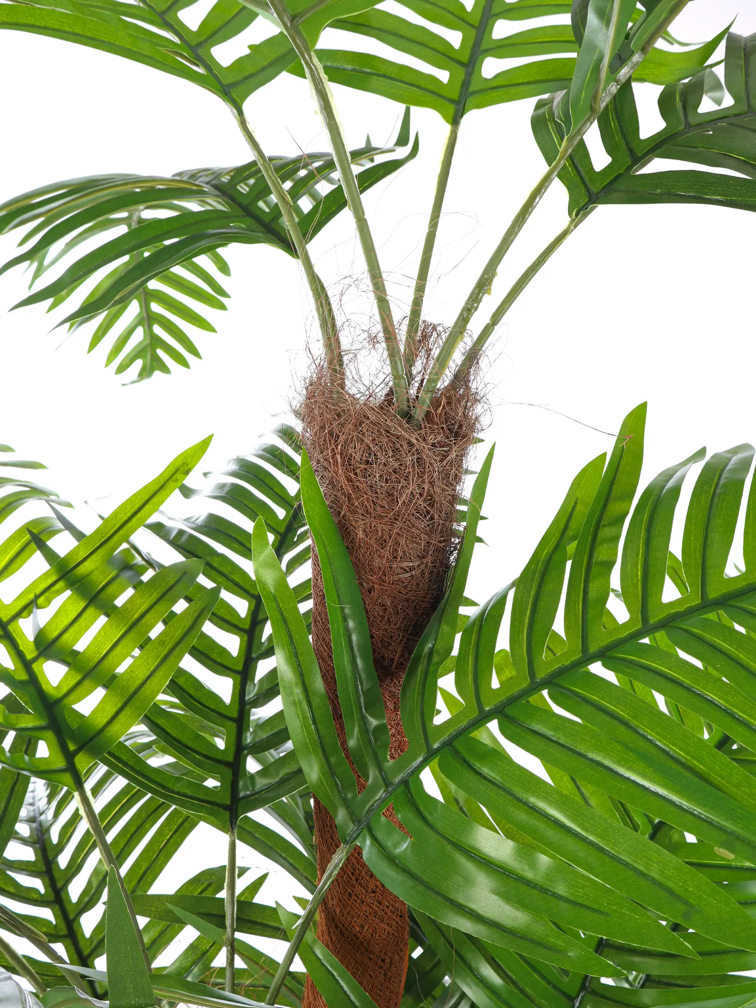 De palmboom heeft een robuuste uitstraling door de vijf stevige stammen, die omwikkeld zijn met natuurlijke bruine kokosvezel. Dit geeft een realistisch effect en zorgt ervoor dat de palmboom nauwelijks van een echte kokospalm te onderscheiden is. De diepgroene palmbladeren zijn flexibel en eenvoudig in model te buigen dankzij de interne metaaldraad, waardoor je de uitstraling naar wens kunt aanpassen. In volledig uitgevouwen staat heeft deze kunstpalm een diameter van ongeveer 80 cm, maar afhankelijk van de ruimte en de pot waarin hij wordt geplaatst, kan deze smaller of juist breder worden gevormd.