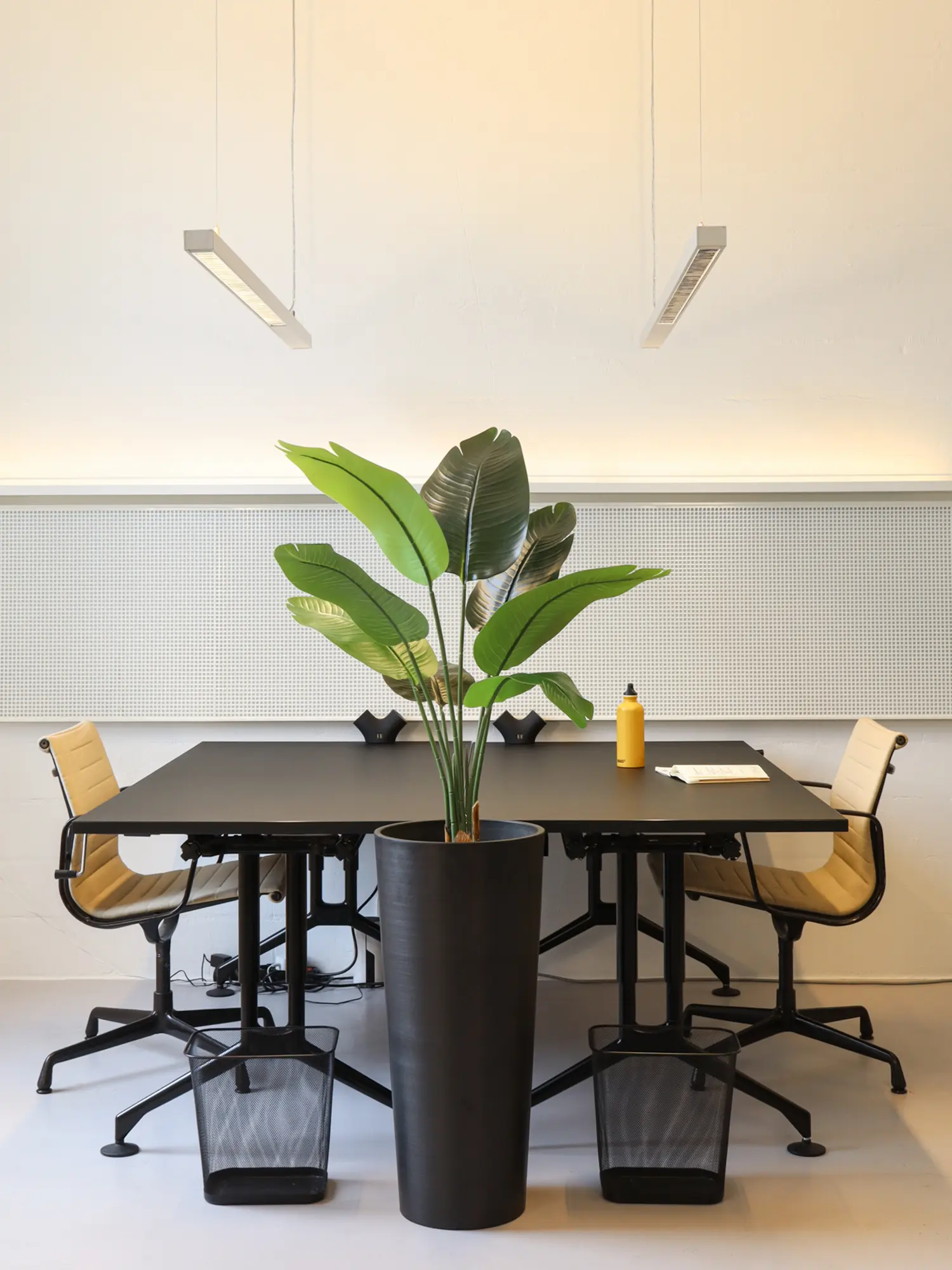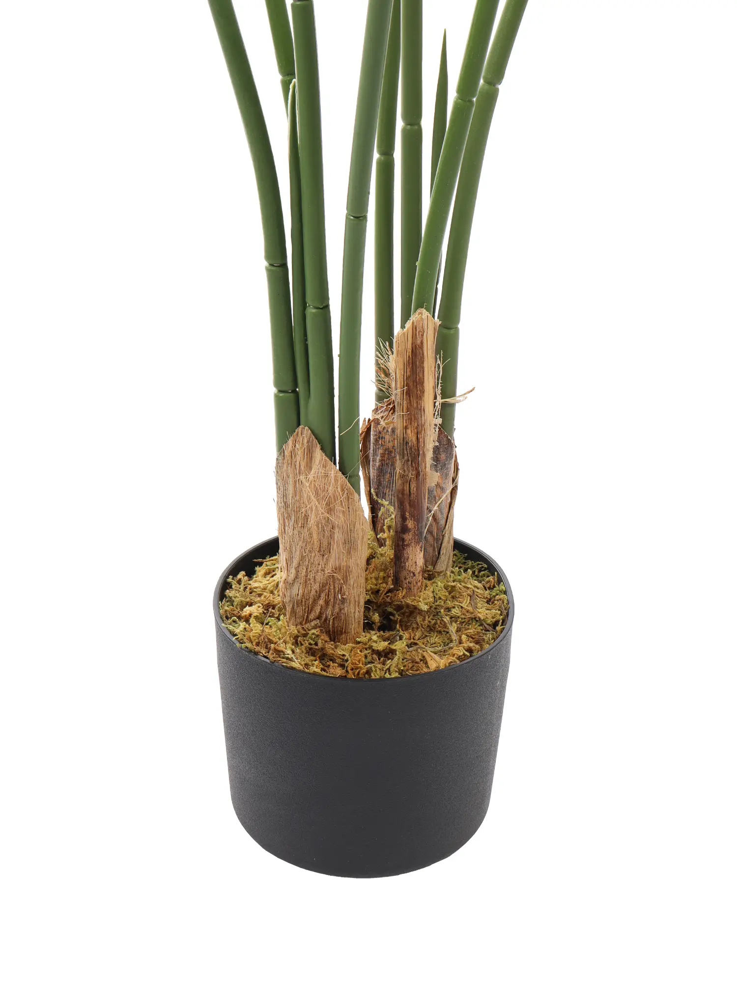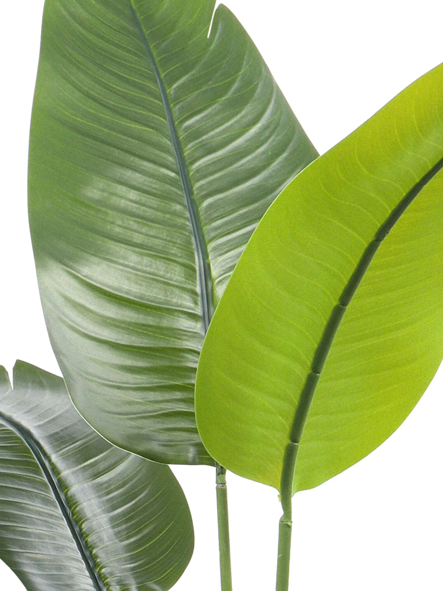 De kunstplant heeft vier stevige stammen, waaruit elegante Strelitzia-stengels ontspringen. Deze stengels lopen uit in lange, levensechte bladeren die op verschillende hoogtes uitwaaieren. Het resultaat? Een dynamisch, natuurlijk ogend silhouet met een speels licht- en schaduweffect, ideaal voor kleinere ruimtes waar je toch een tropische sfeer wilt creëren.