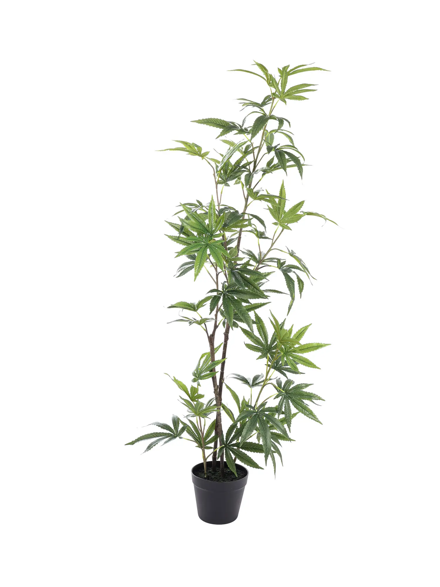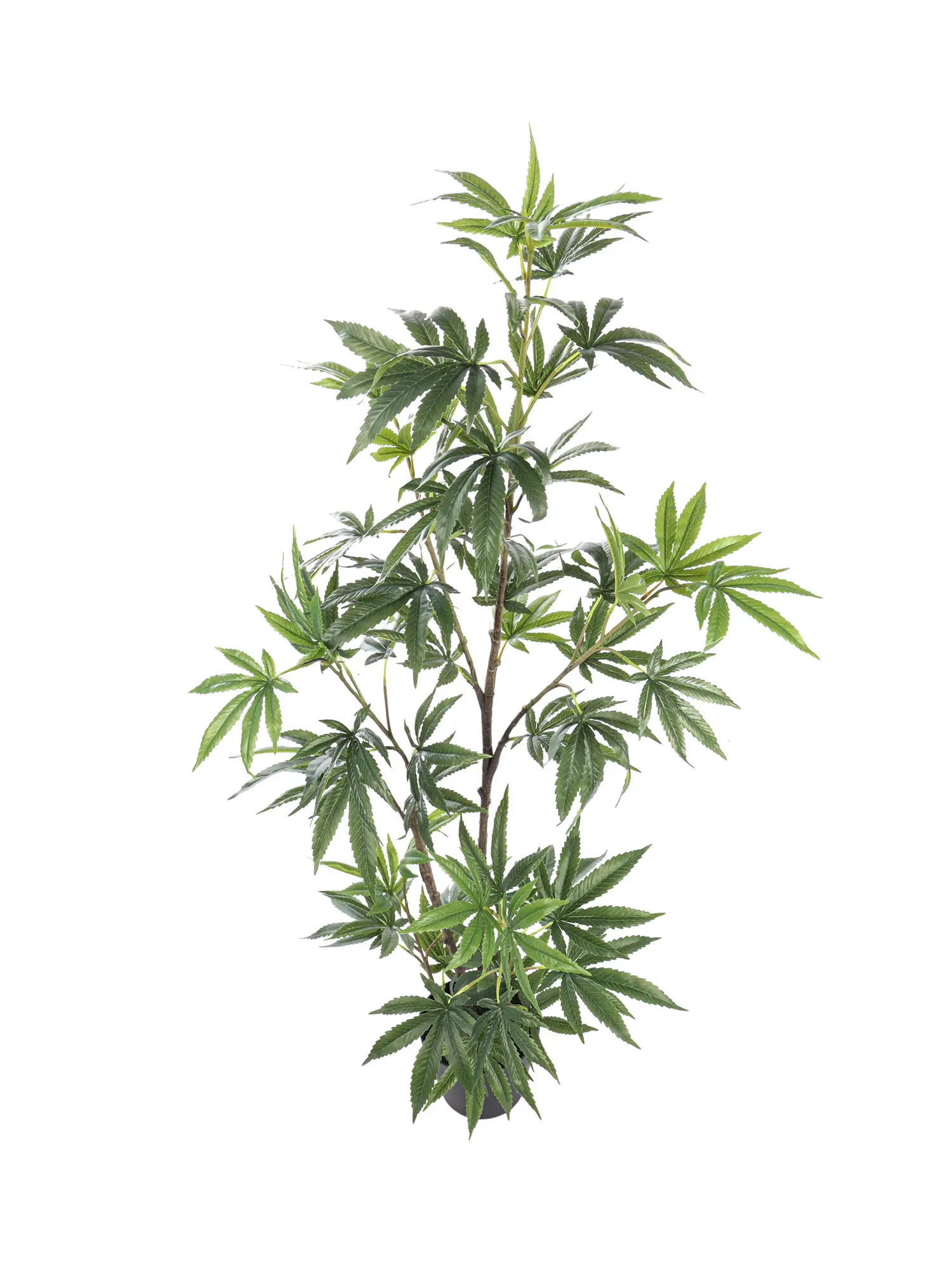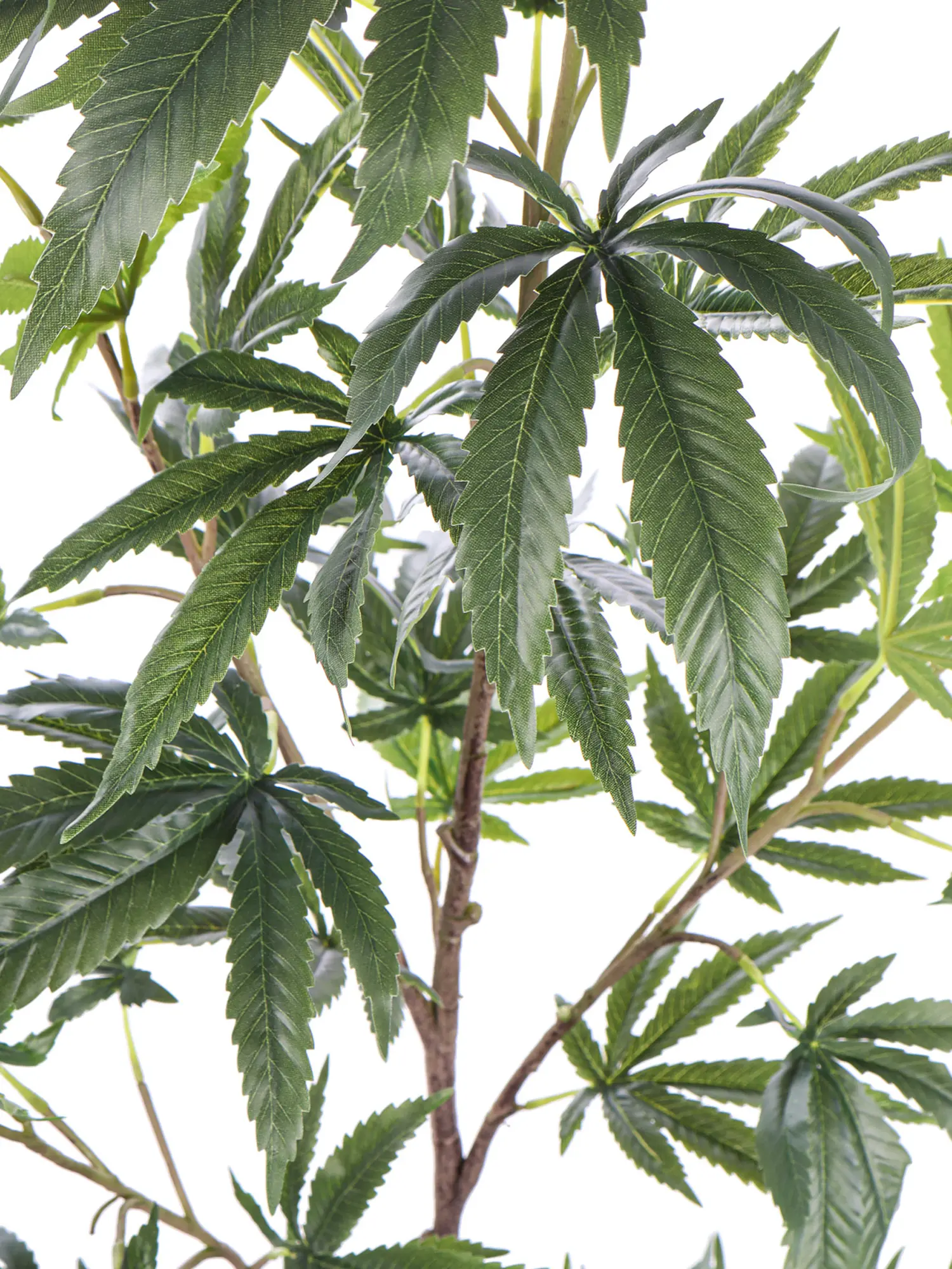 Deze kunstplant is rijkelijk voorzien van levensechte wietbladeren in verschillende formaten en groentinten. Vanuit de stevige zwarte pot groeien vier plantenstengels omhoog, elk met een verschillende hoogte en smalle vorm, zoals ook bij echte hennepplanten het geval is.