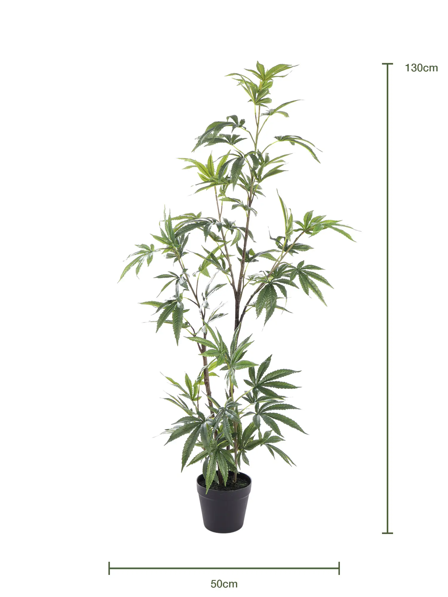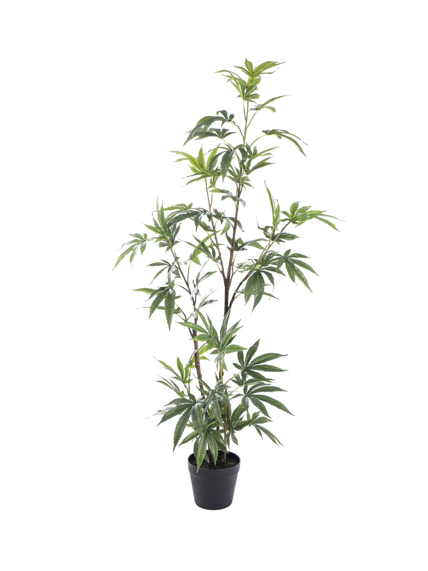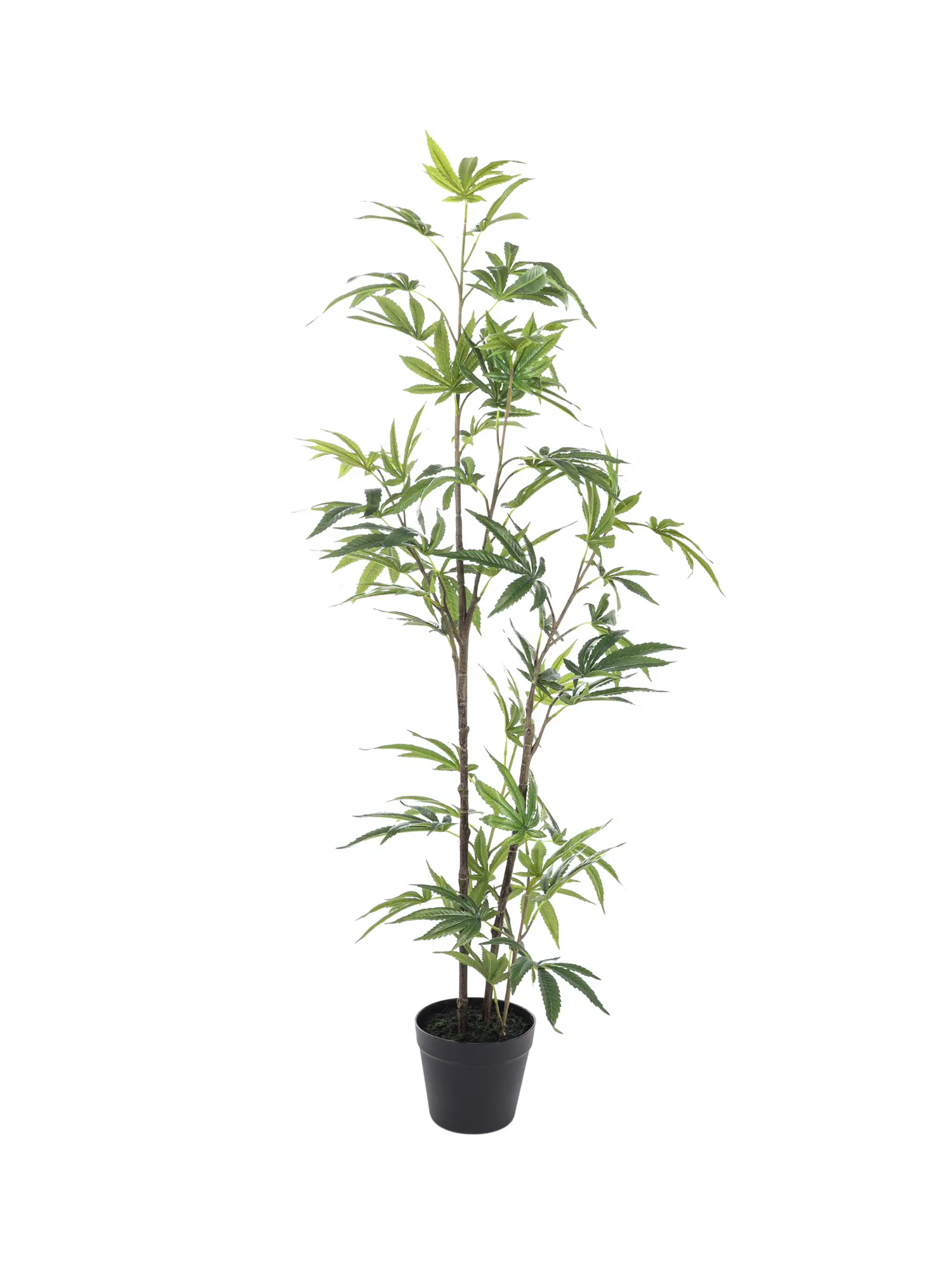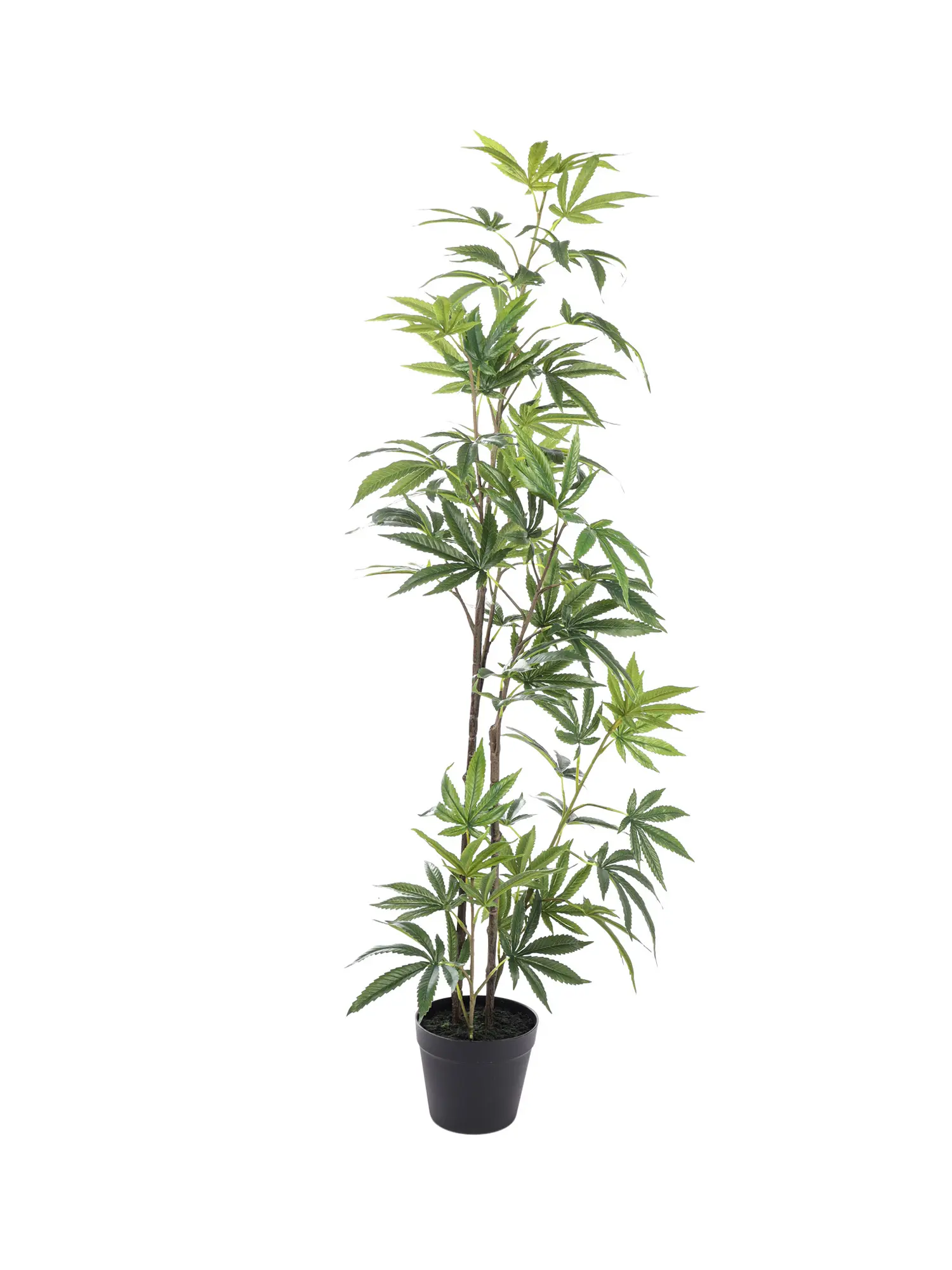 Deze kunstplant is rijkelijk voorzien van levensechte wietbladeren in verschillende formaten en groentinten. Vanuit de stevige zwarte pot groeien vier plantenstengels omhoog, elk met een verschillende hoogte en smalle vorm, zoals ook bij echte hennepplanten het geval is.