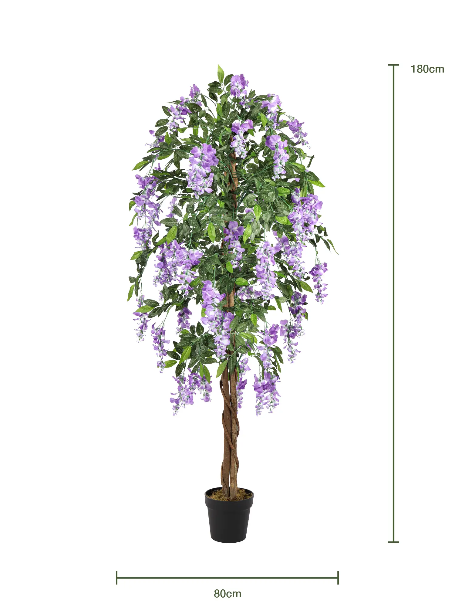 De takken en bloemen zijn eenvoudig naar wens in vorm te buigen. Eenmaal in vorm blijven de takken ook goed in model zitten. De paarse bloemtrossen hangen over de gehele kunst-Wisteriaboom weelderig naar beneden. In opdracht van Kunstpalm.nl is deze partij Blauwe Regen kunstplanten van extra veel takken en bloemen voorzien. Zo hebben we een zeer volle en kleurrijke paarse kunstbloemboom ontwikkeld, die er ook van alle kanten mooi en vol uitziet. Met een hoogte van 180cm is dit dan ook een flink formaat kunstbloemboom. De diameter van de kruin is na het uitvouwen van de takken zo’n 80cm. Je kunt de takken en paarse Wisteria-bloemen naar wens dichter bij de stam of juist meer open positioneren.