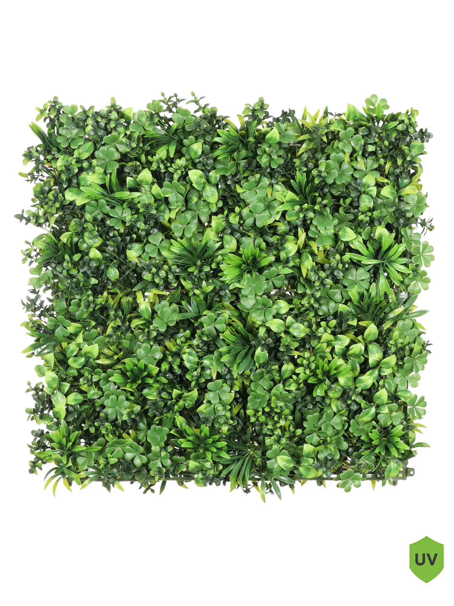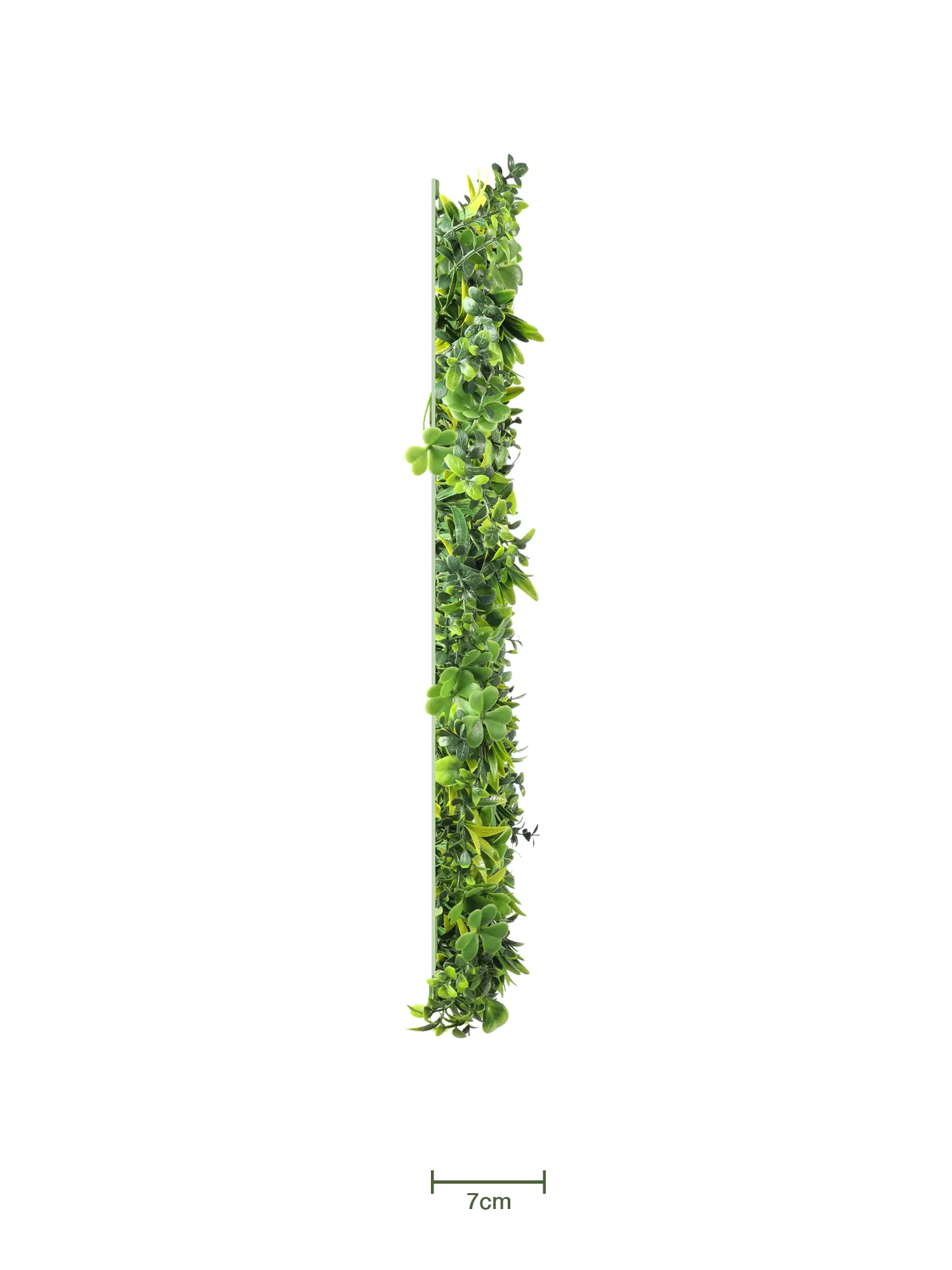 De Kunsthaag Vetplant Wand – 50x50cm is een verfijnde en levensechte kunstwand, perfect voor het creëren van een groene oase in elke ruimte. Dit paneel bevat een harmonieuze mix van vetplanten en groene bladeren in diverse tinten, van diep donkergroen tot fris lichtgroen. Door de variatie in bladstructuren en de natuurgetrouwe plaatsing krijgt de wand een volle, natuurlijke uitstraling met een subtiele dieptewerking. De takjes steken speels uit tot wel 7cm, waardoor het geheel extra levendig oogt.