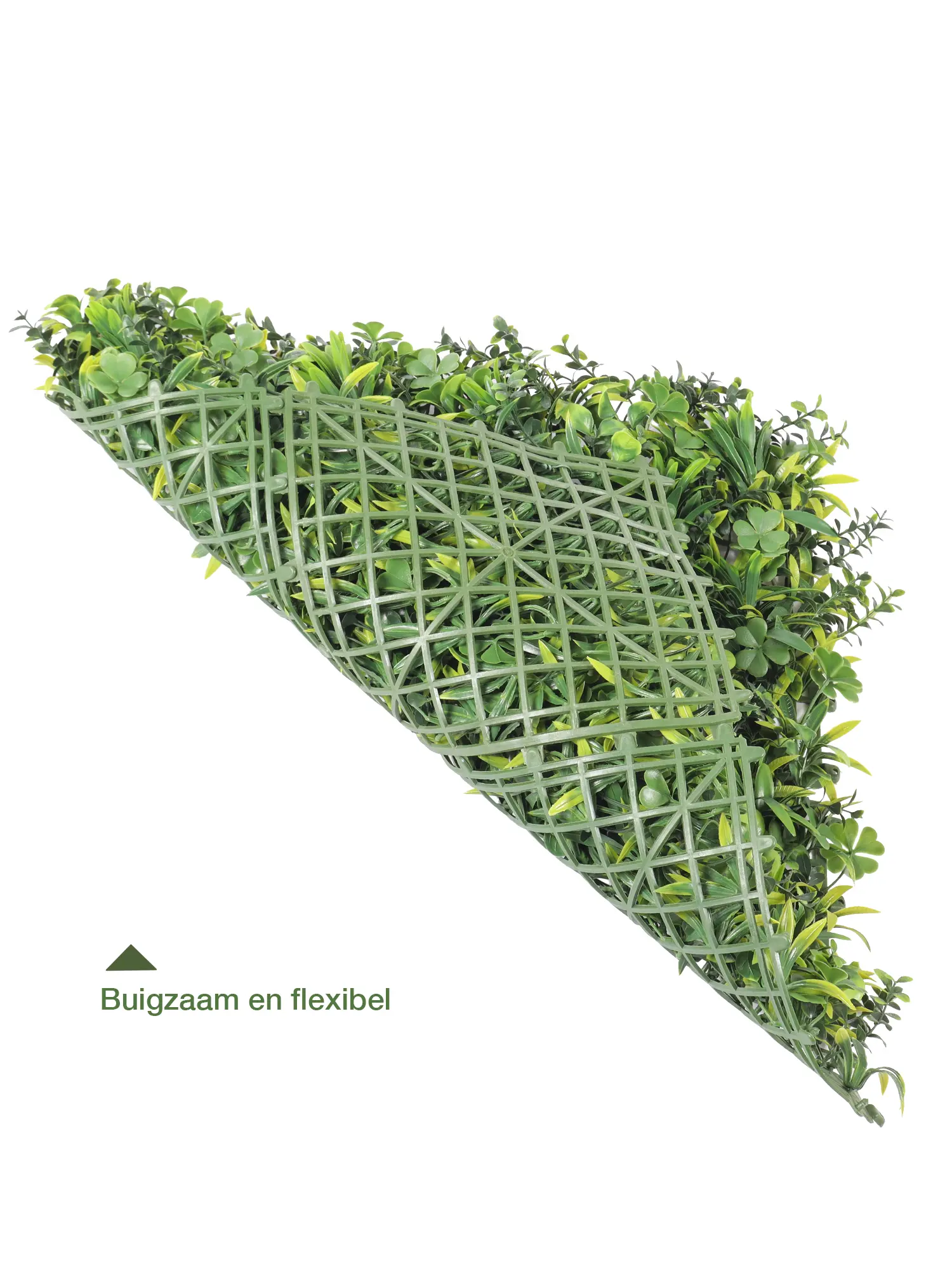 Binnen enkele minuten realiseer je een stijlvolle, groene wand die direct goed in model valt. Dankzij de flexibiliteit kan de kunstvetplanten wand zich moeiteloos aanpassen aan gebogen structuren zoals balkonrelingen of afrasteringen. Voor het mooiste effect adviseren wij de wand te monteren tegen een donkere achtergrond om lichtdoorval te minimaliseren.