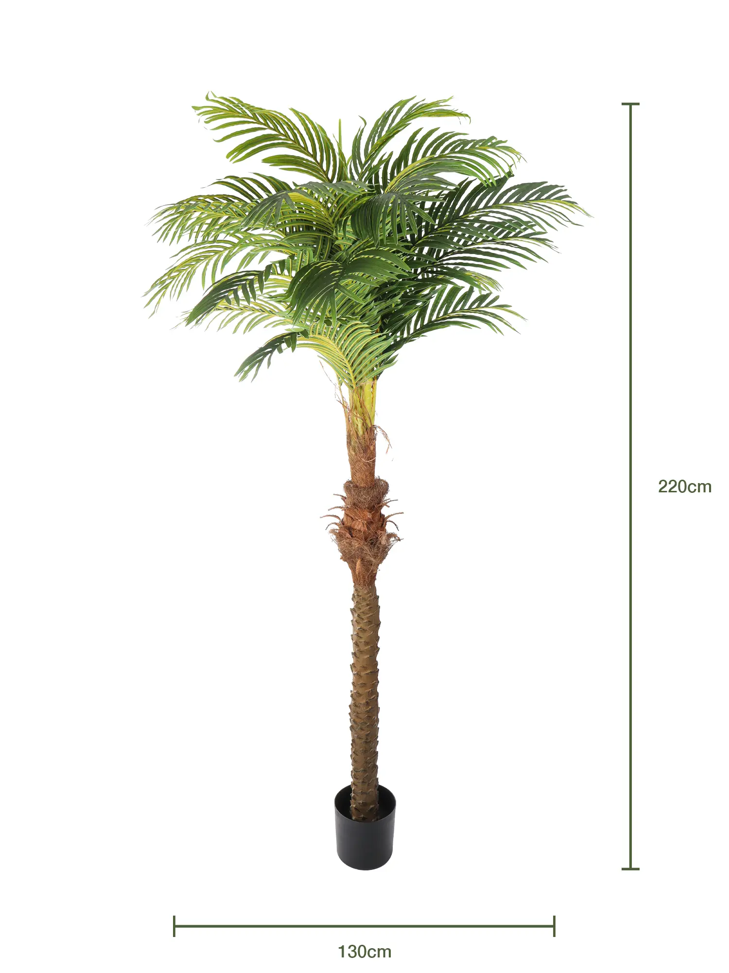 De hoogte van deze kunstpalmboom is zo’n 220cm van onderkant pot tot bovenkant bladeren.