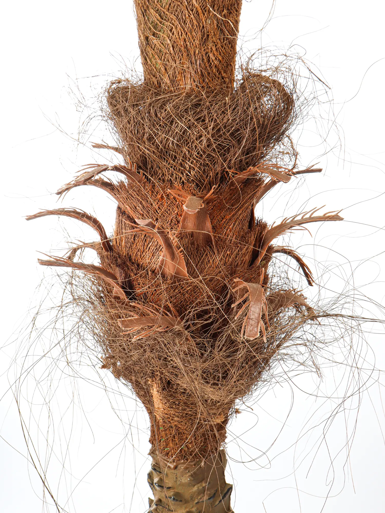 Aan de bovenkant van de stam zit een verdikking van bruin palmhaar en zijscheuten.