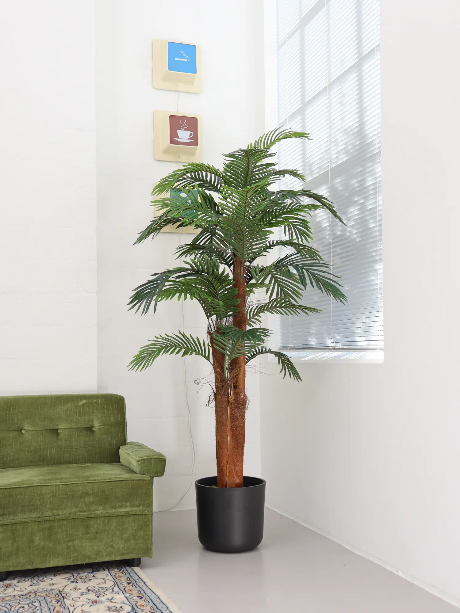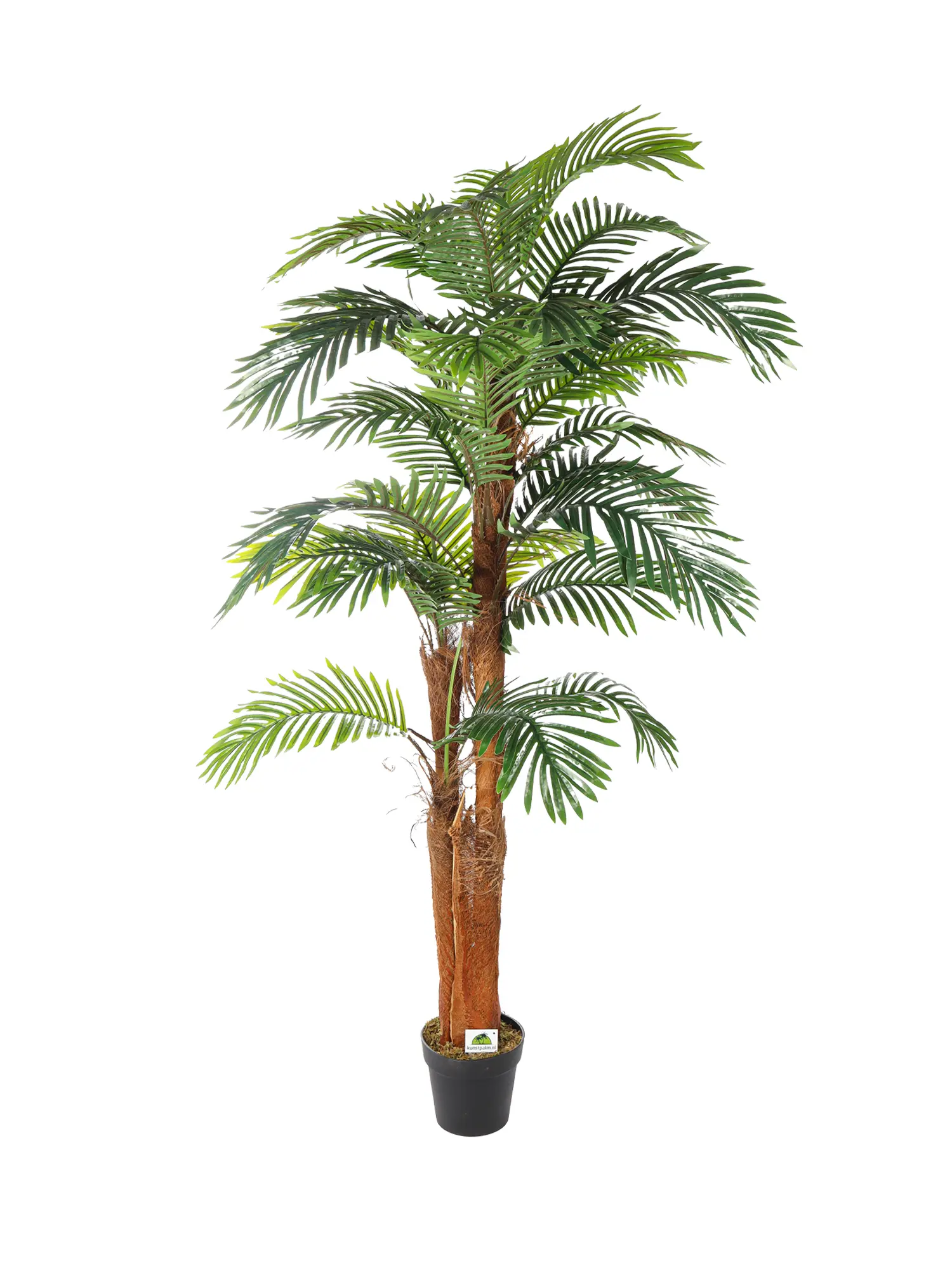 Deze 180cm hoge kunstpalm is voorzien van 4 stevige donker bruine kokosstammetjes en vier volle groene blad rozetten.