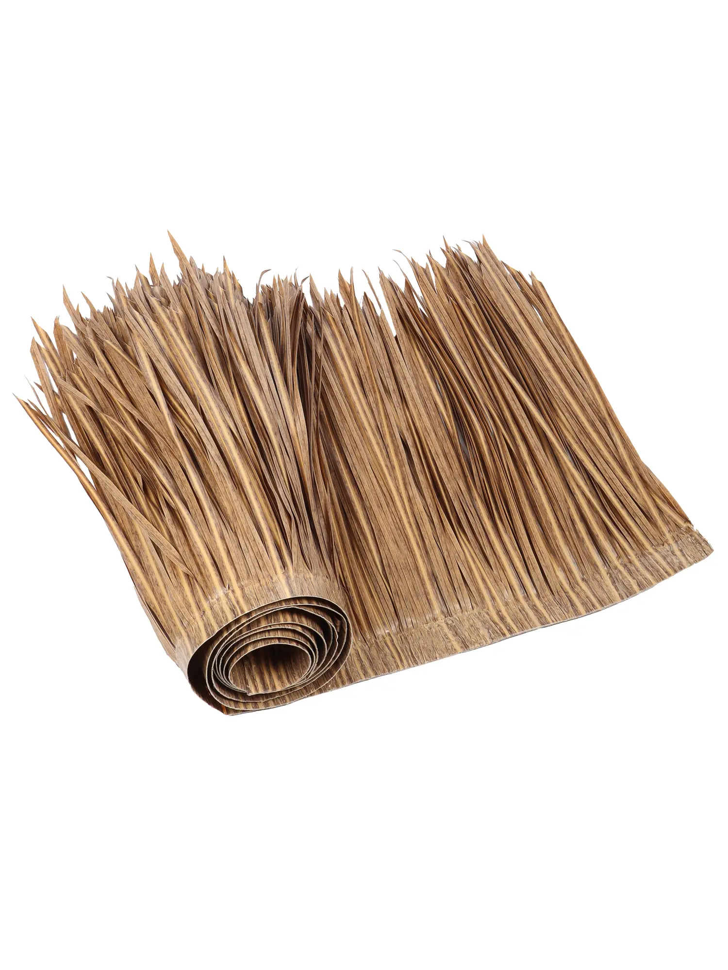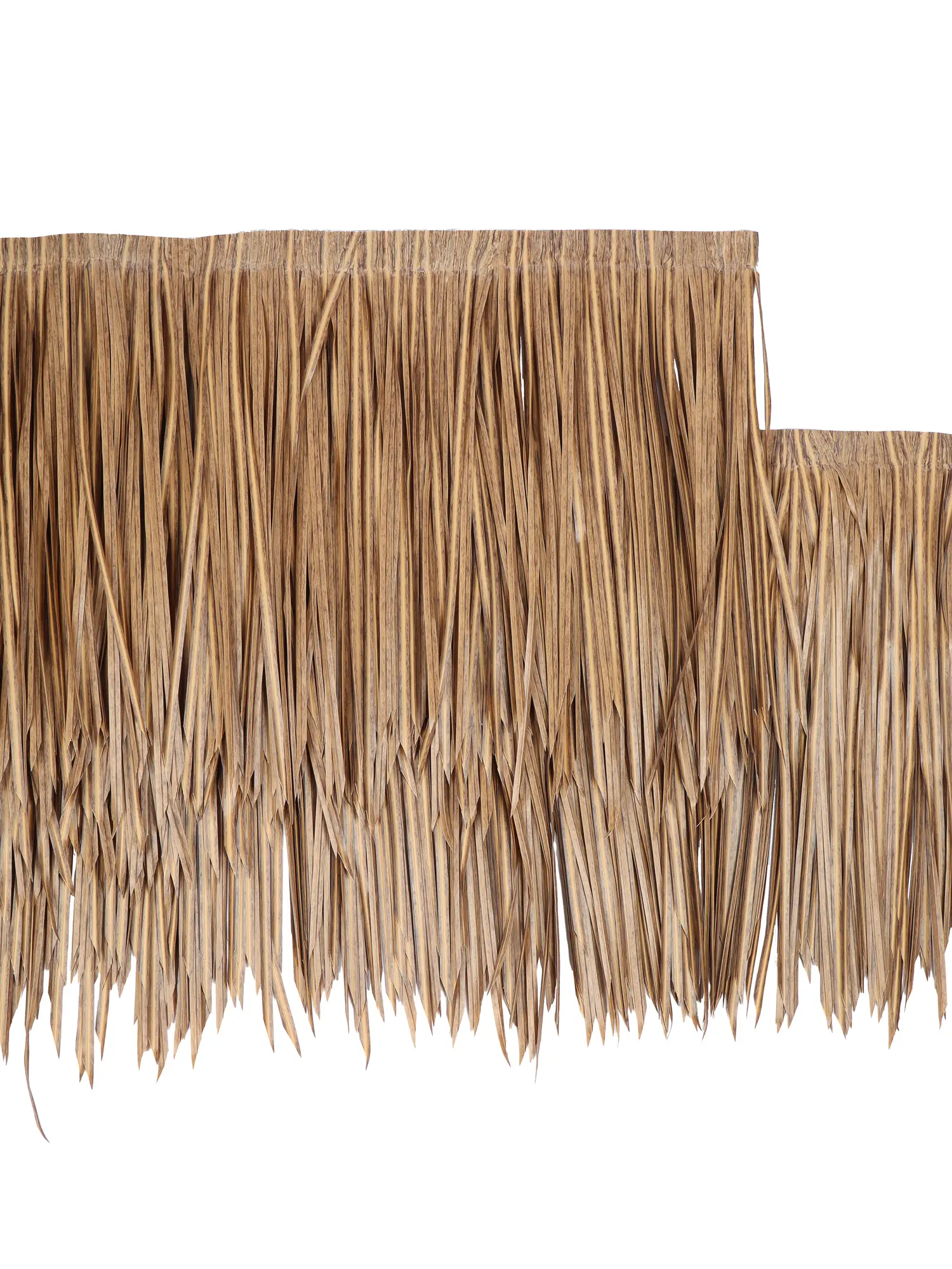 Dankzij de natuurlijke kleurcombinatie – een mix van lichtbruin, beige en donkerbruin – heeft deze brandwerende rieten dakbedekking een authentieke uitstraling. De speelse, naar beneden hangende slierten bootsen de look van een traditioneel rieten dak na en zorgen voor een tropische en exotische ambiance.