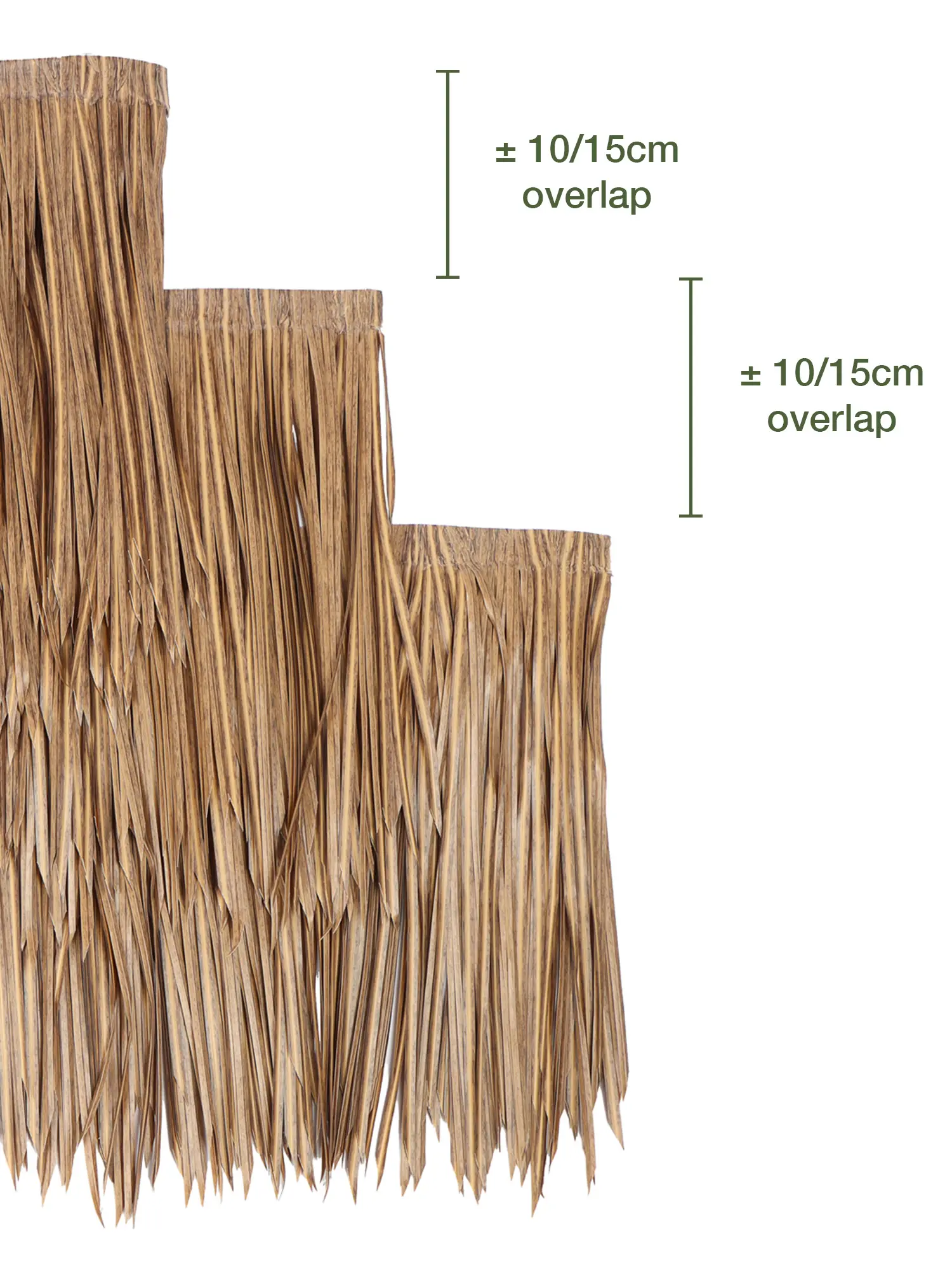 - Overlapping voor een naadloos geheel: Wij adviseren om de lagen brandvertragend kunstriet elkaar te laten overlappen met ongeveer 35 tot 40 cm. Hierdoor ontstaat een volle, natuurlijke uitstraling en lijkt het dakje één geheel. Uiteraard kun je de mate van overlapping aanpassen afhankelijk van het te bedekken oppervlak en de gewenste dichtheid. Doordat iedere nieuwe laag ongeveer 10 tot 15 cm hoger ligt dan de vorige, sluiten de rieten stroken perfect op elkaar aan.