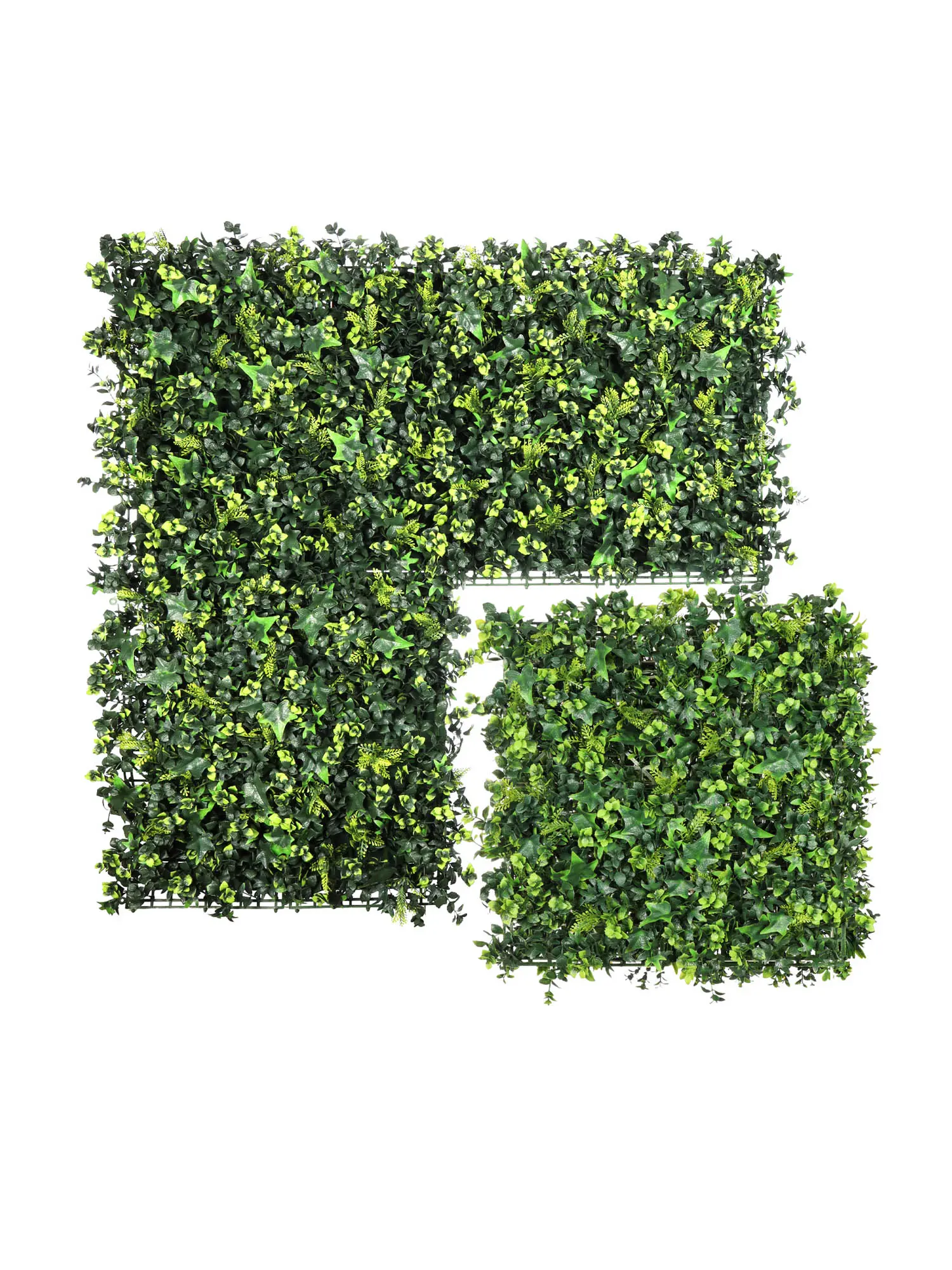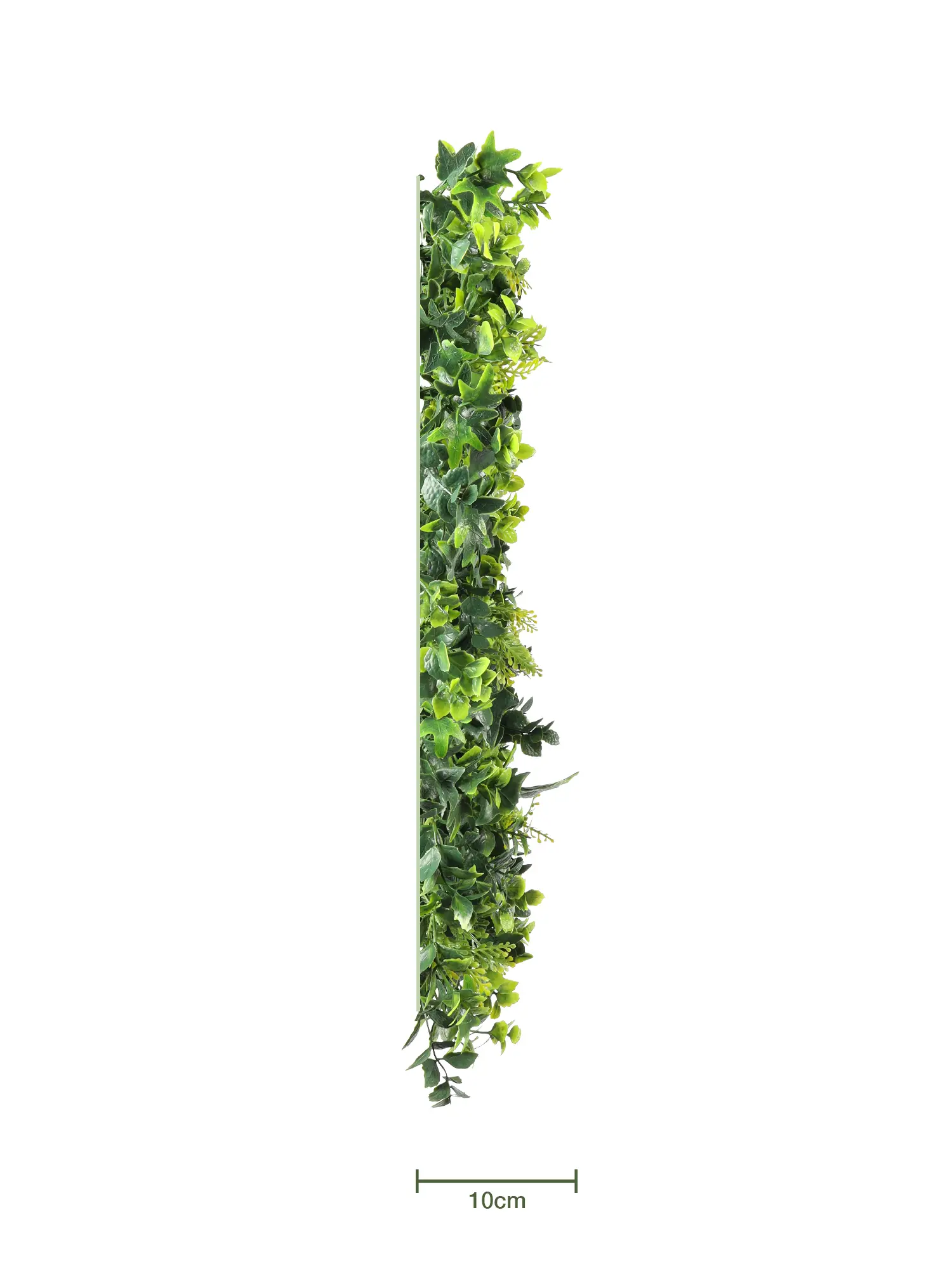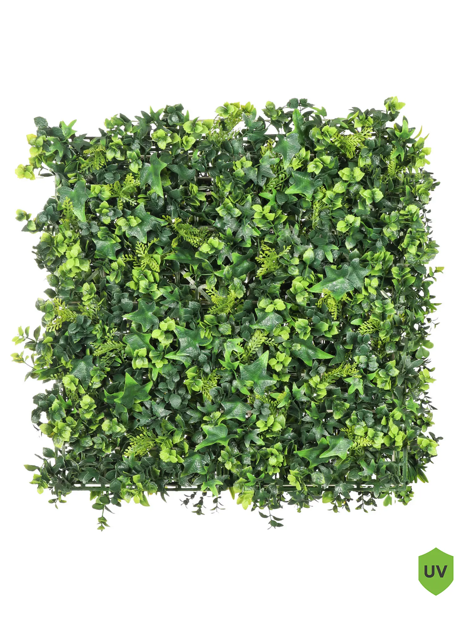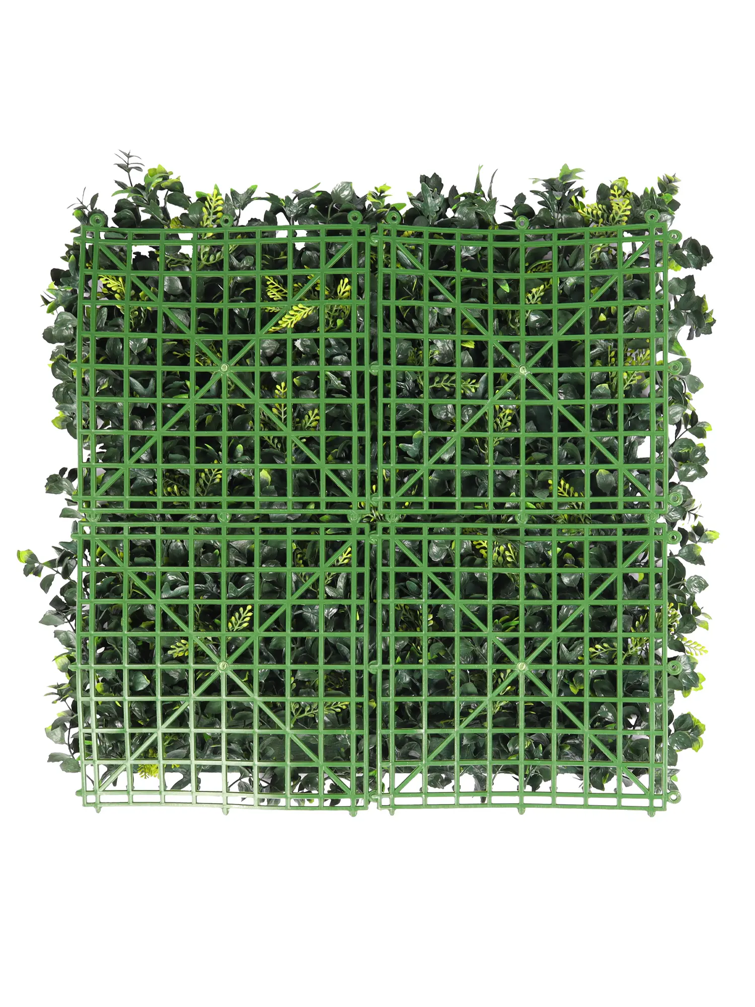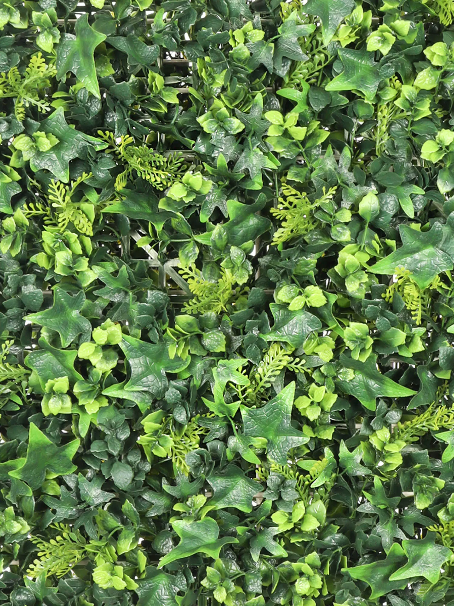 De Mixblad Kunsthaag – 50x50cm is een fraai ontworpen haagmat van uitstekende kwaliteit, samengesteld uit diverse soorten kunstplantjes, zoals varentakjes, sedumplantjes en Hederablad. Door de harmonieus gemengde samenstelling ontstaat een levendige en natuurlijke uitstraling. De basiskleur van deze haagmat is donkergroen, met subtiele overgangen naar lichter groen aan de uiteinden van de plantjes. Dit zorgt voor een realistisch effect van een levende, groene wand.